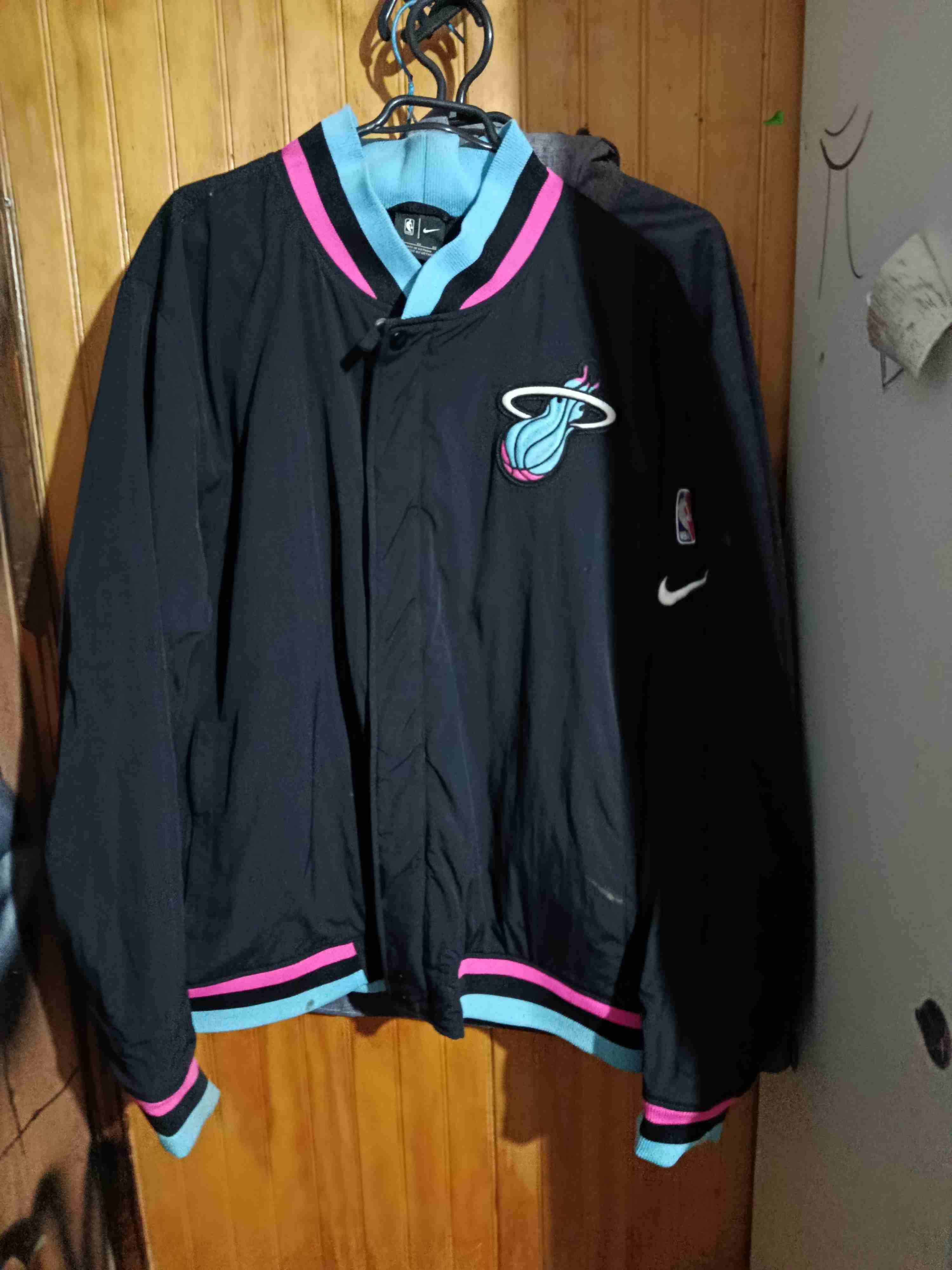 Chaqueta deportiva negra con detalles en rosa y celeste. Ideal para vestirse en climas frescos o eventos casuales. En buen estado general.