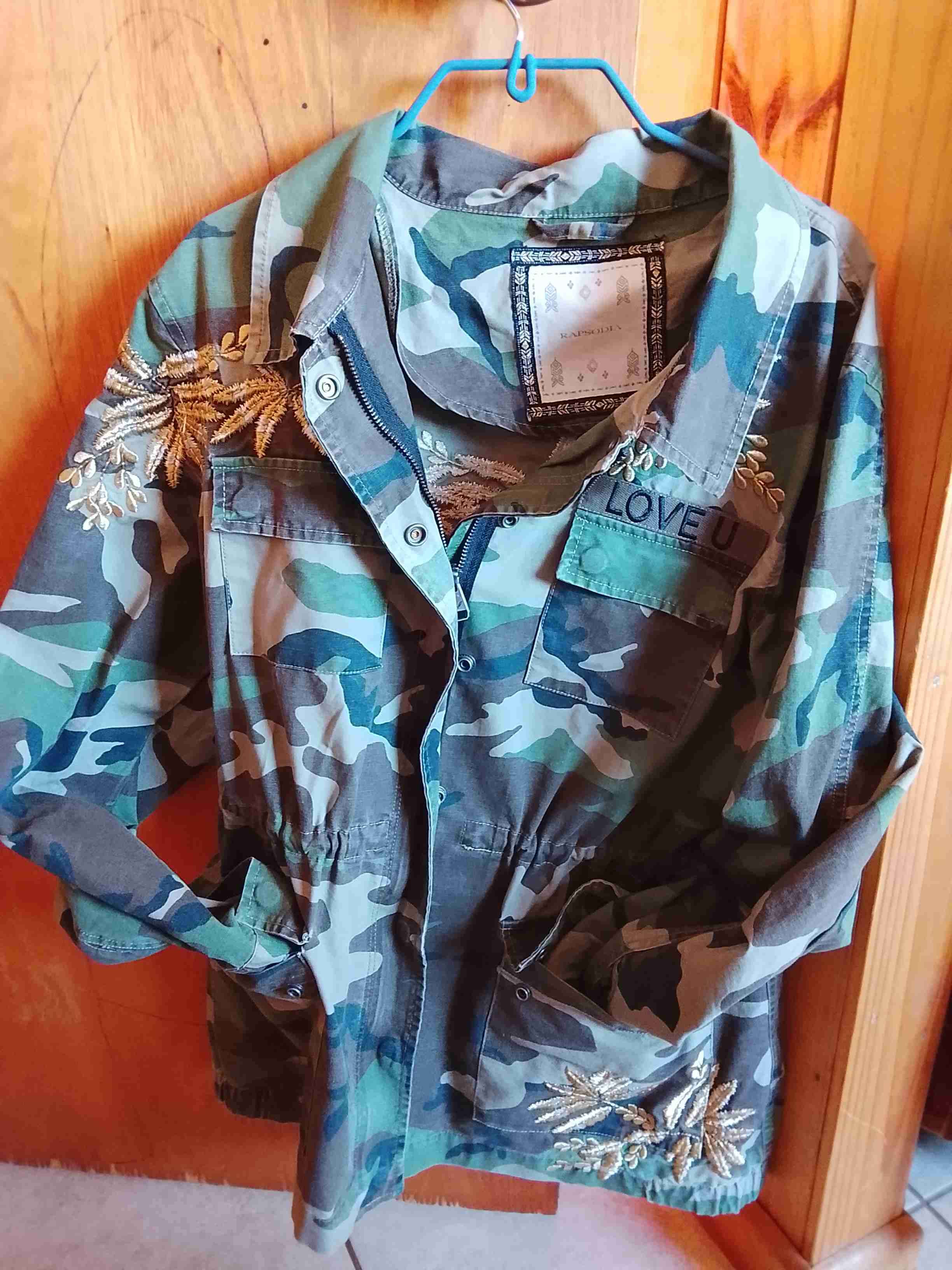 Chaqueta con estampado militar y detalles bordados en buen estado. Ideal para un look casual y desenfadado.