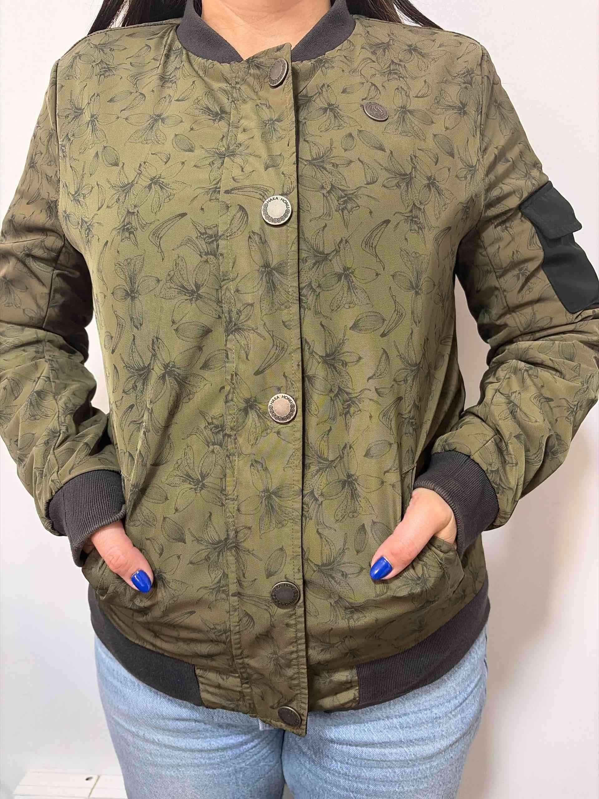 Chaqueta estilo bomber verde oliva con diseño floral. En buen estado, ideal para un look casual.