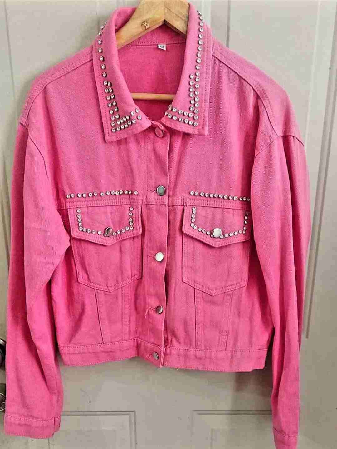Chaqueta rosa con tachas decorativas, estilo denim. Ideal para salidas casuales. En buen estado.
