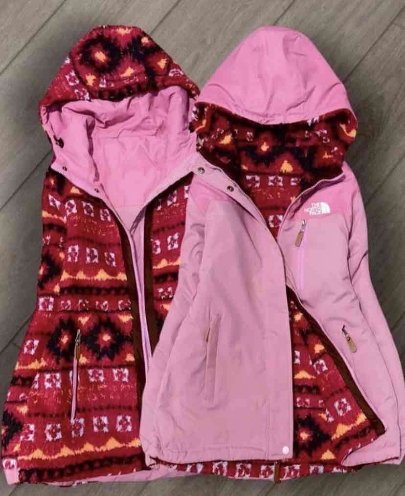 Chaqueta rosa reversible, con diseño interior colorido, ideal para el invierno, talla S, NUEVA!!.