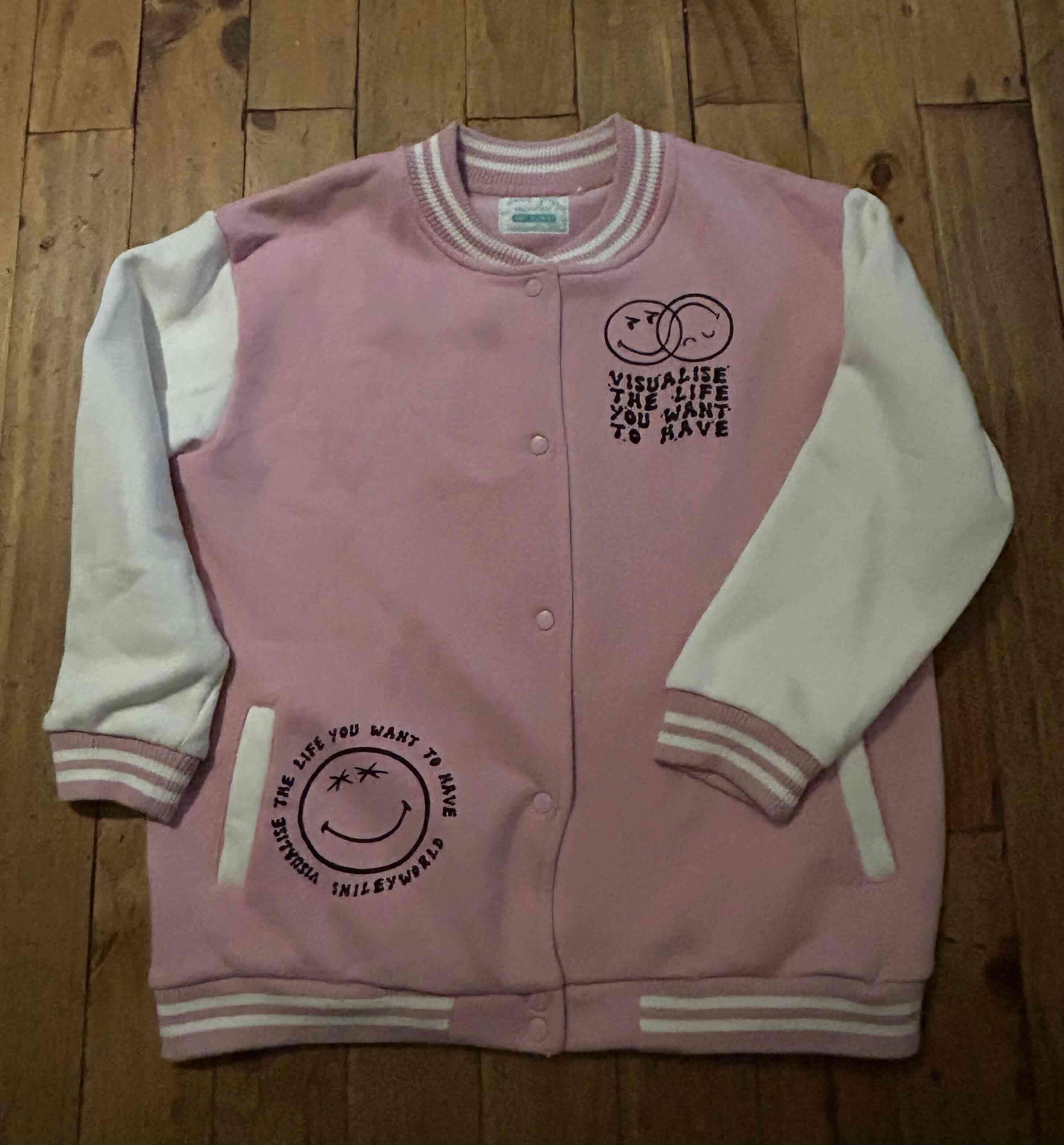 Chaqueta en rosa y blanco con diseño gráfico al frente. Ideal para un look casual y juvenil. Buen estado general, poco uso, talla 14