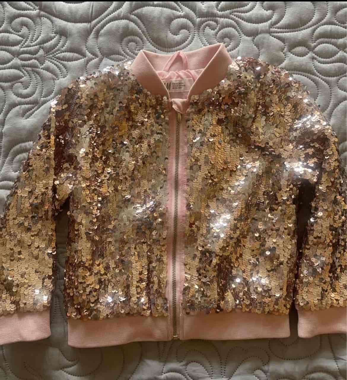 Chaqueta infantil rosada con lentejuelas doradas, ideal para ocasiones especiales. Buen estado general talla 3-4 años H&M
