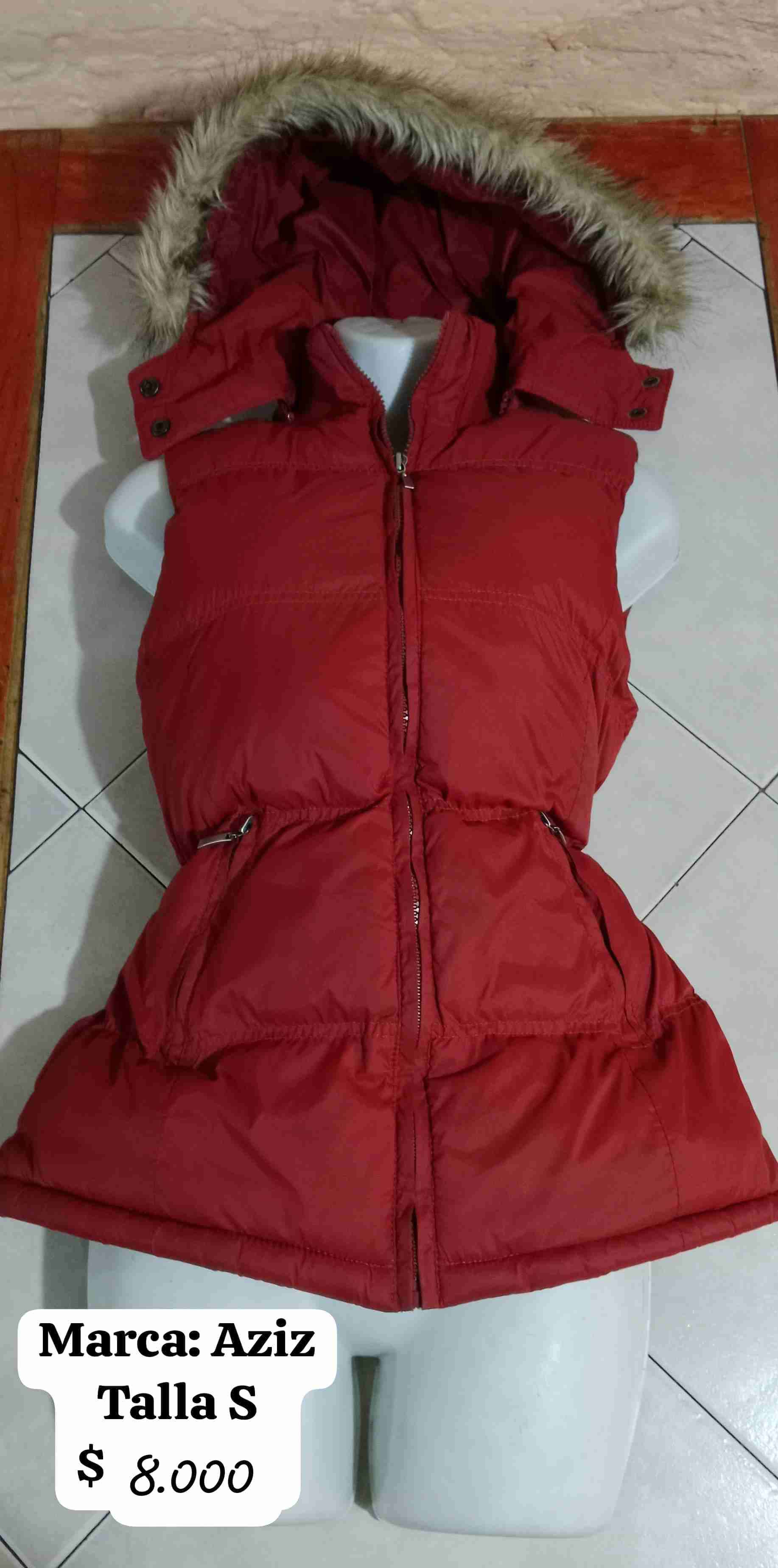 Chaqueta sin mangas acolchado rojo con capucha de piel sintética, ideal para el invierno. En buen estado, perfecto para abrigarse en días fríos.
