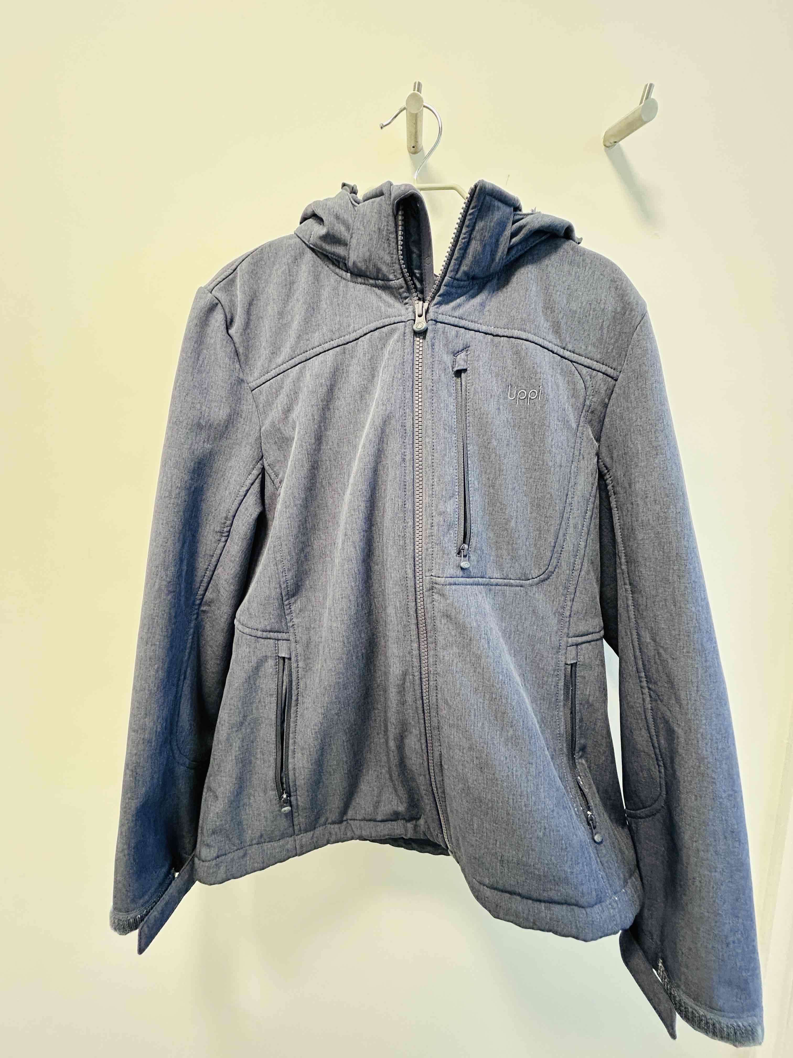 Chaqueta softshell morada casual con cierres y capucha. En buen estado, interior térmico ideal para el invierno.