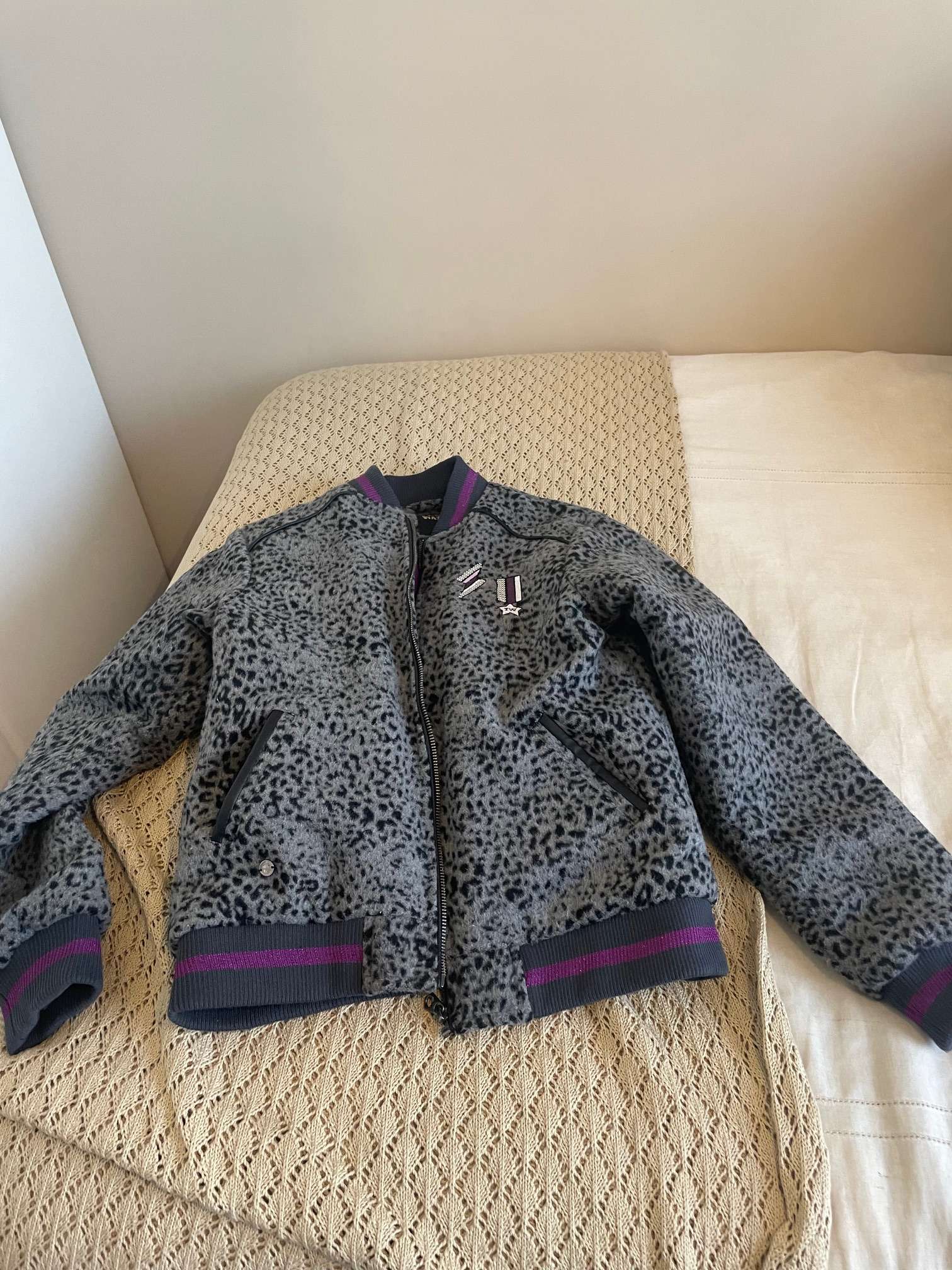 Chaqueta talla 12 marca tween way. animal print gris y negra, con fondo acolchado por interior color morado. Con cierre y 2 bolsillos laterales.