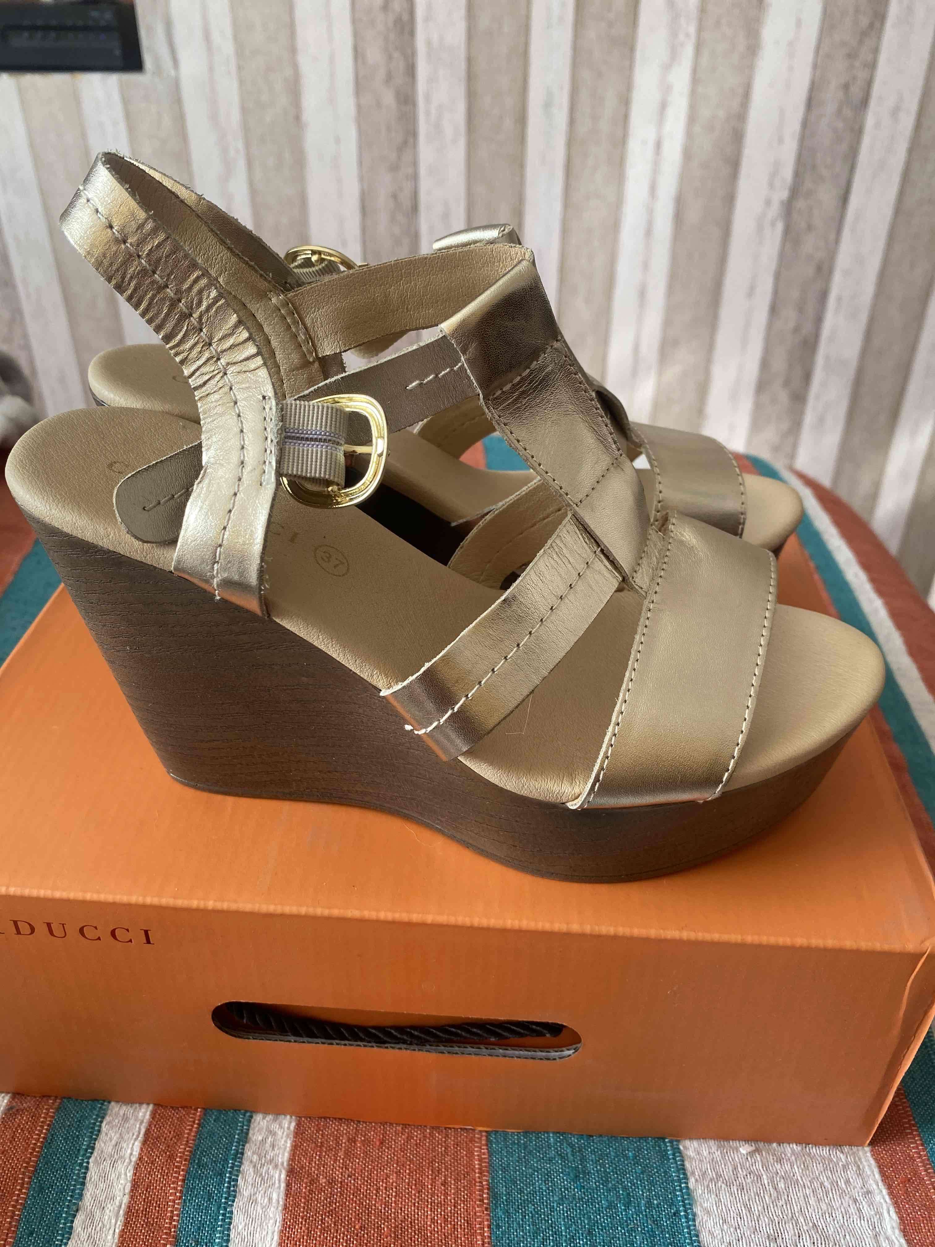 Sandalias doradas de plataforma alta, cuero, NUEVAS SIN USO elegantes y modernas. Buen estado, ideales para el verano o eventos casuales. Precio referencial 46.990