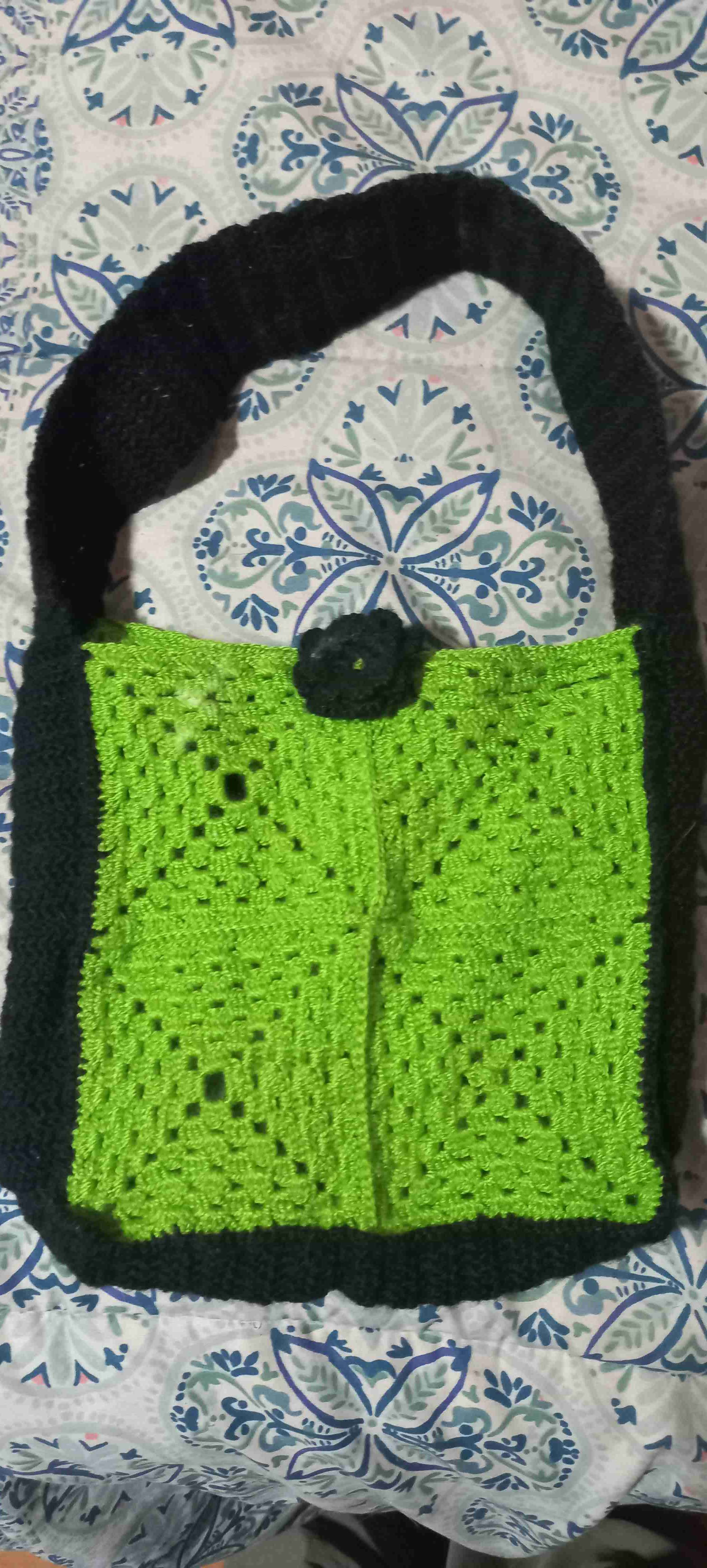Bolso estilo artesanal en colores verde y negro, ideal para un look casual. Se ve en buen estado y es espacioso para llevar lo necesario.