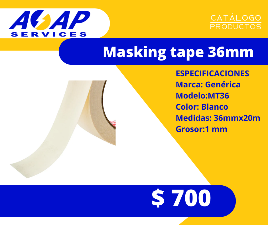 Cinta de papel crepé (masking tape) de alta adherencia, ideal para trabajos de pintura, manualidades o embalaje ligero. Su diseño permite un desprendimiento limpio sin dejar residuos de pegamento en la superficie. Especificaciones técnicas: Marca: Genérica (Modelo MT36). Ancho: 36 mm. Largo: 20 metros. Color: Blanco. Grosor: 1 mm. Uso: Protección de bordes en pintura, rotulado de cajas y fijaciones temporales. Estado: Nuevo.