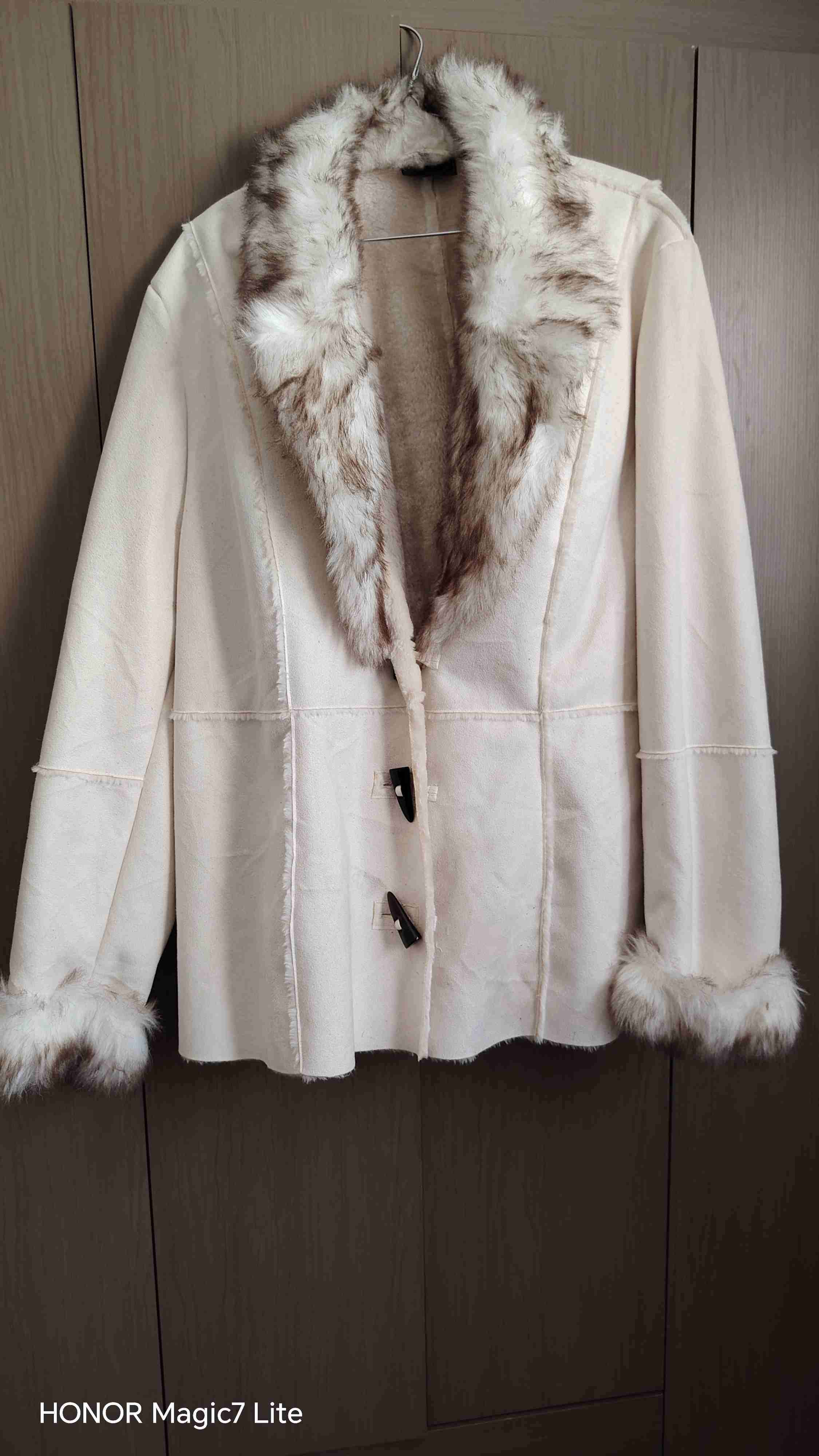 Elegante abrigo de color beige o crema con detalles de piel en cuello y mangas. Diseño moderno y sofisticado, ideal para invierno. En buen estado.Esta prenda es una chaqueta de mujer estilo gamuza o antelina , caracterizada por tener un cuello y puños con forro de piel sintética. NUEVO- SIN USO - sin etiqueta