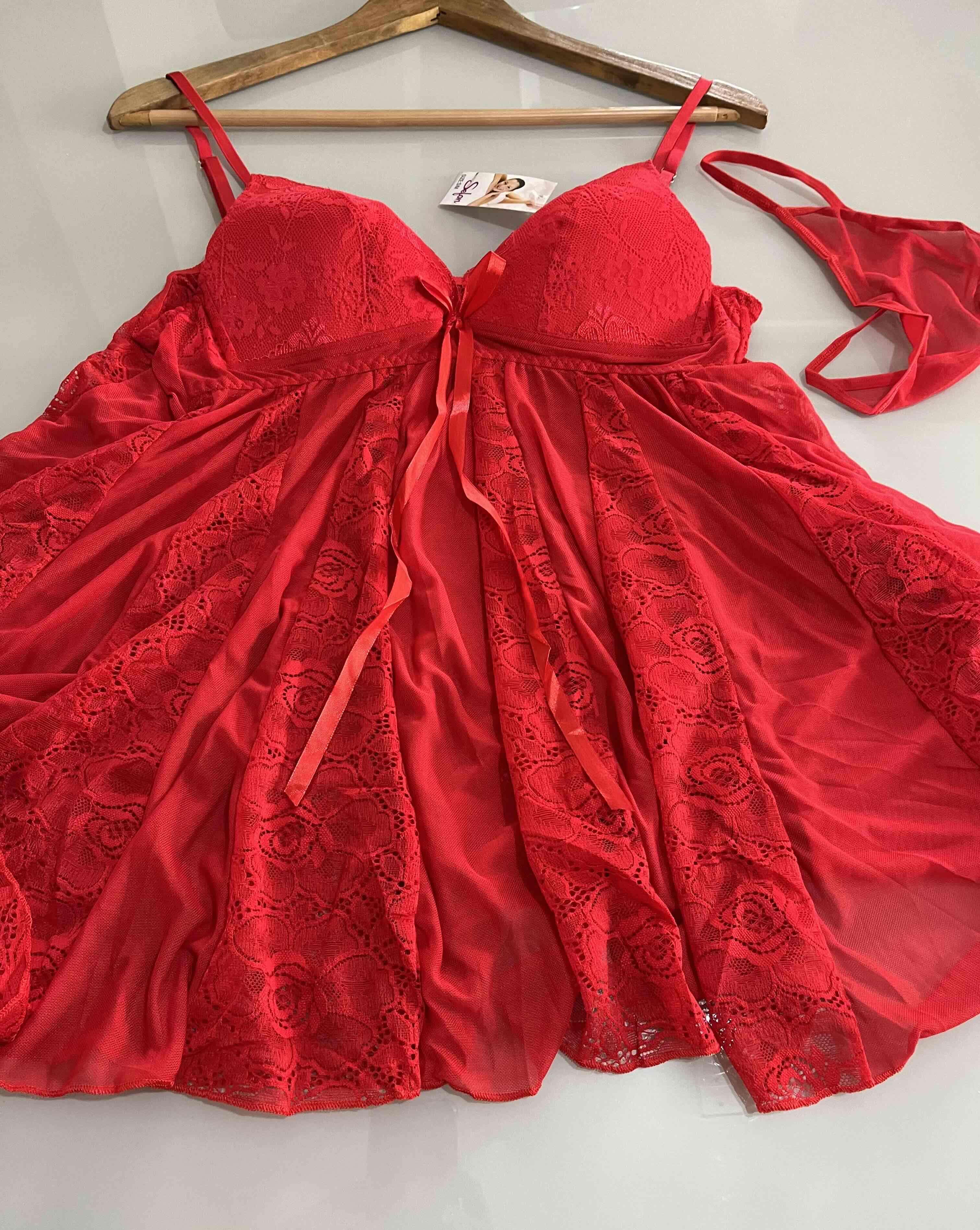 Conjunto babydoll rojo con delicado encaje y tirantes ajustables, perfecto para una noche especial. Nuevo, sin uso.