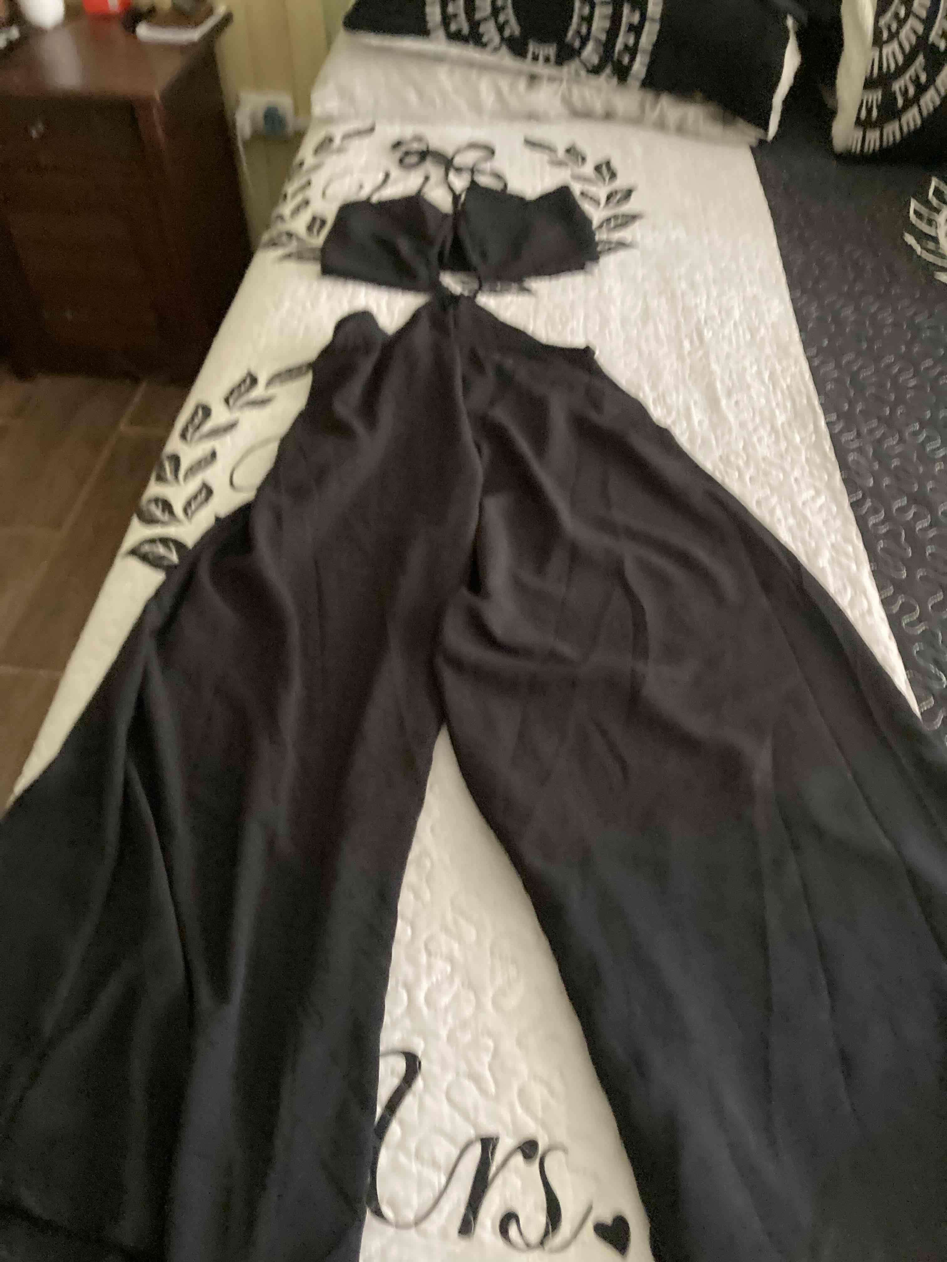 Conjunto de pantalón ancho y top negro, ideal para eventos casuales. Buen estado general, cómodo y elegante.