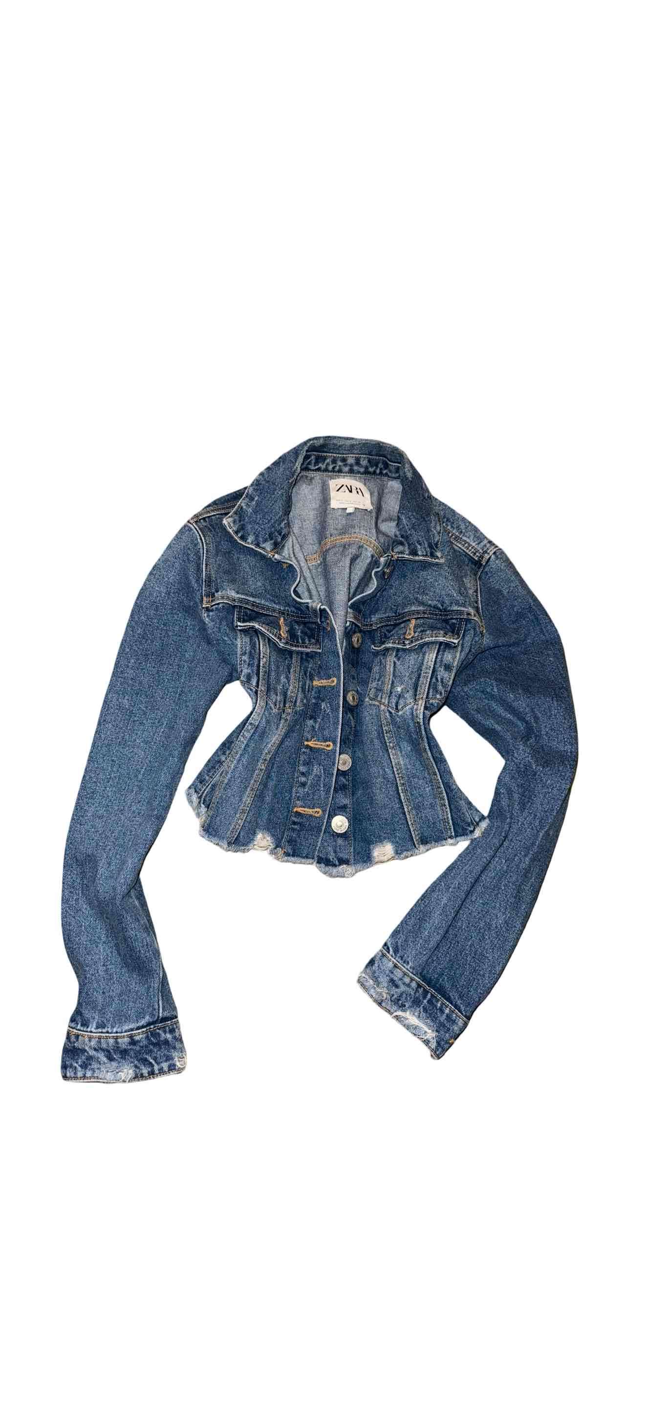 Chaqueta de mezclilla azul para mujer, corte ajustado y clásico. En buen estado, ideal para un look casual.talla m-l