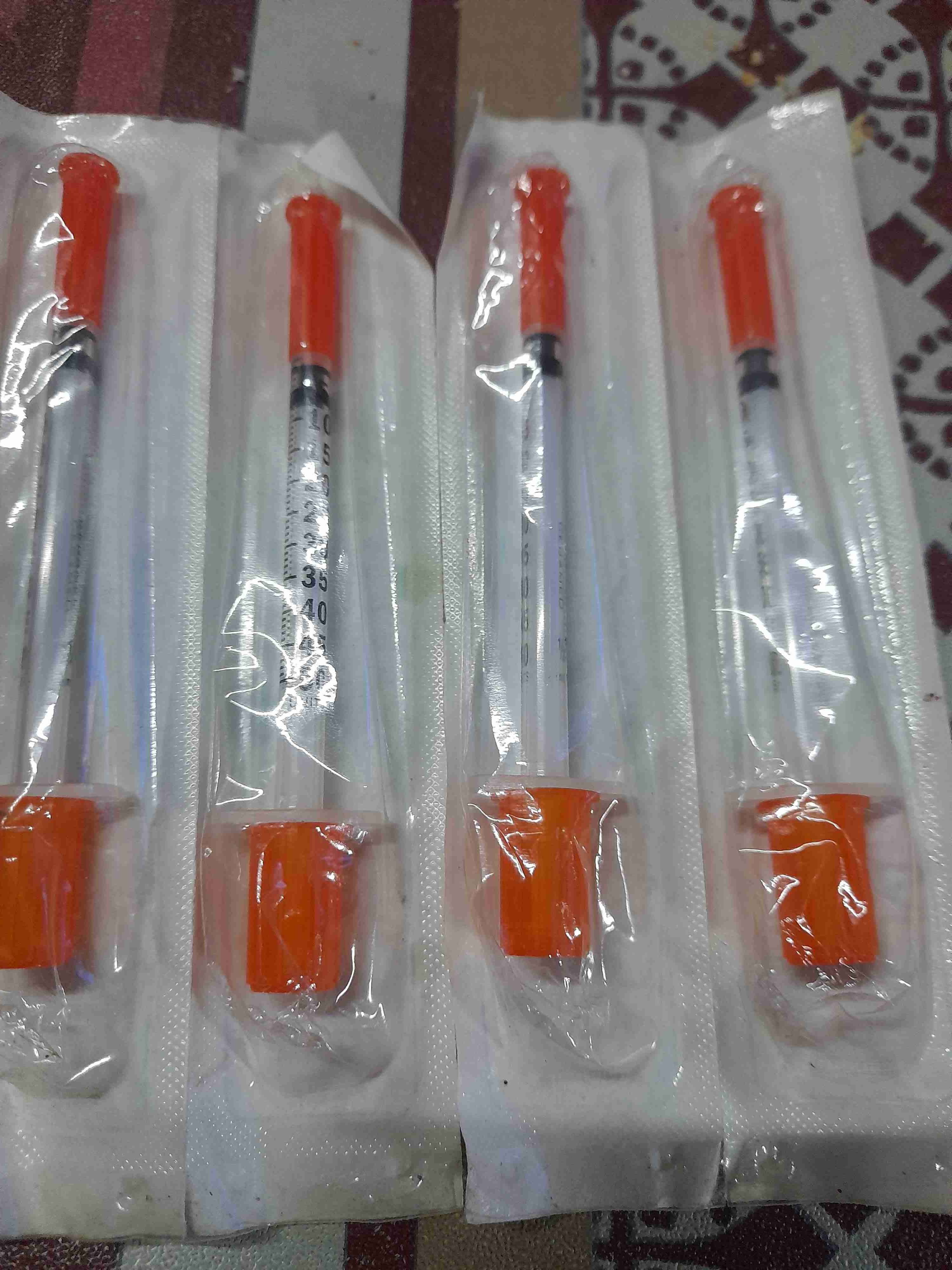 Jeringas de plástico con agujas integradas y tapa naranja. Sin uso y en empaque original. 50mm
