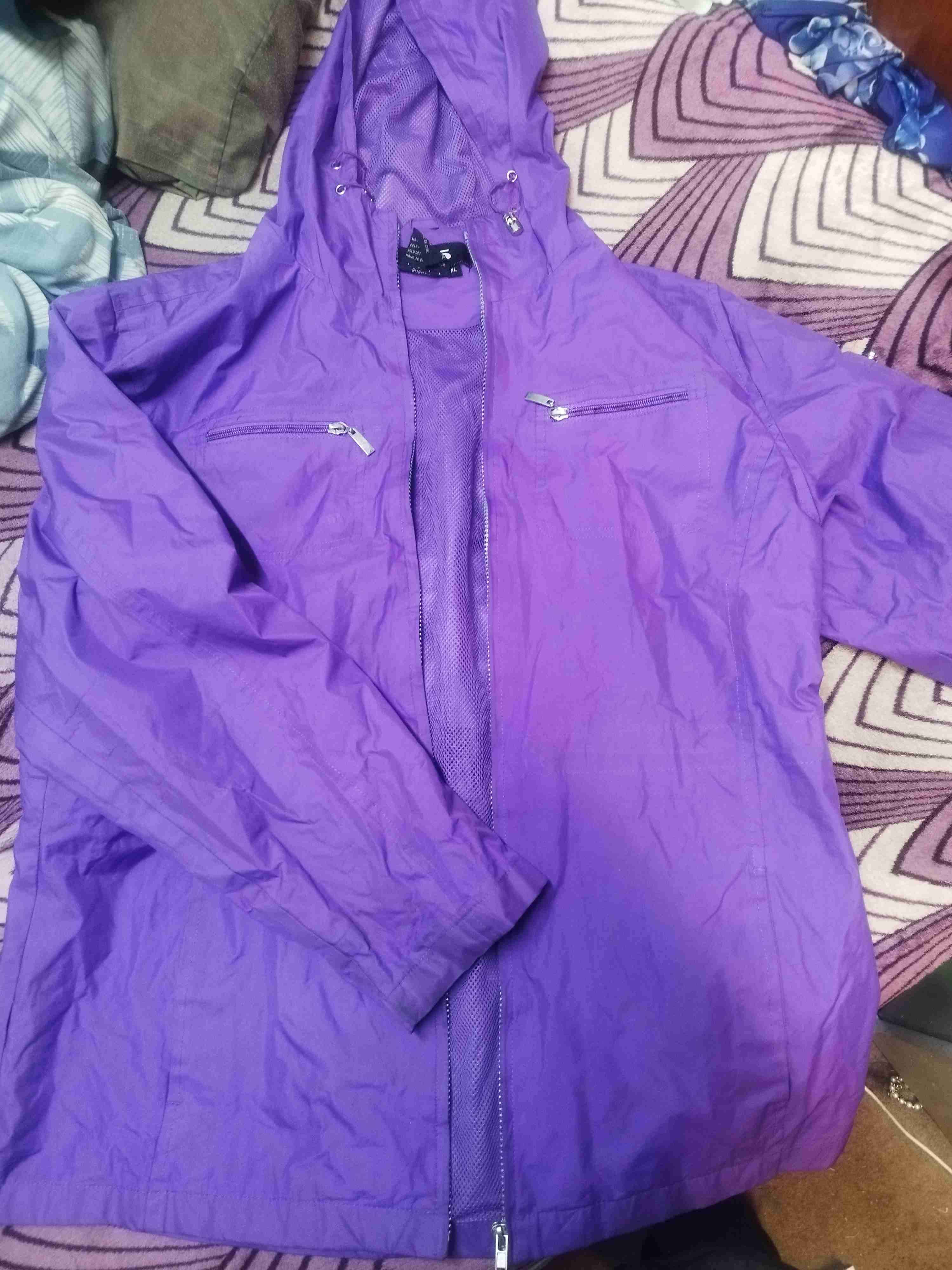 Chaqueta liviana morada, ideal para días frescos. Buen estado general, con capucha práctica para lluvia. Talla XL MUJER