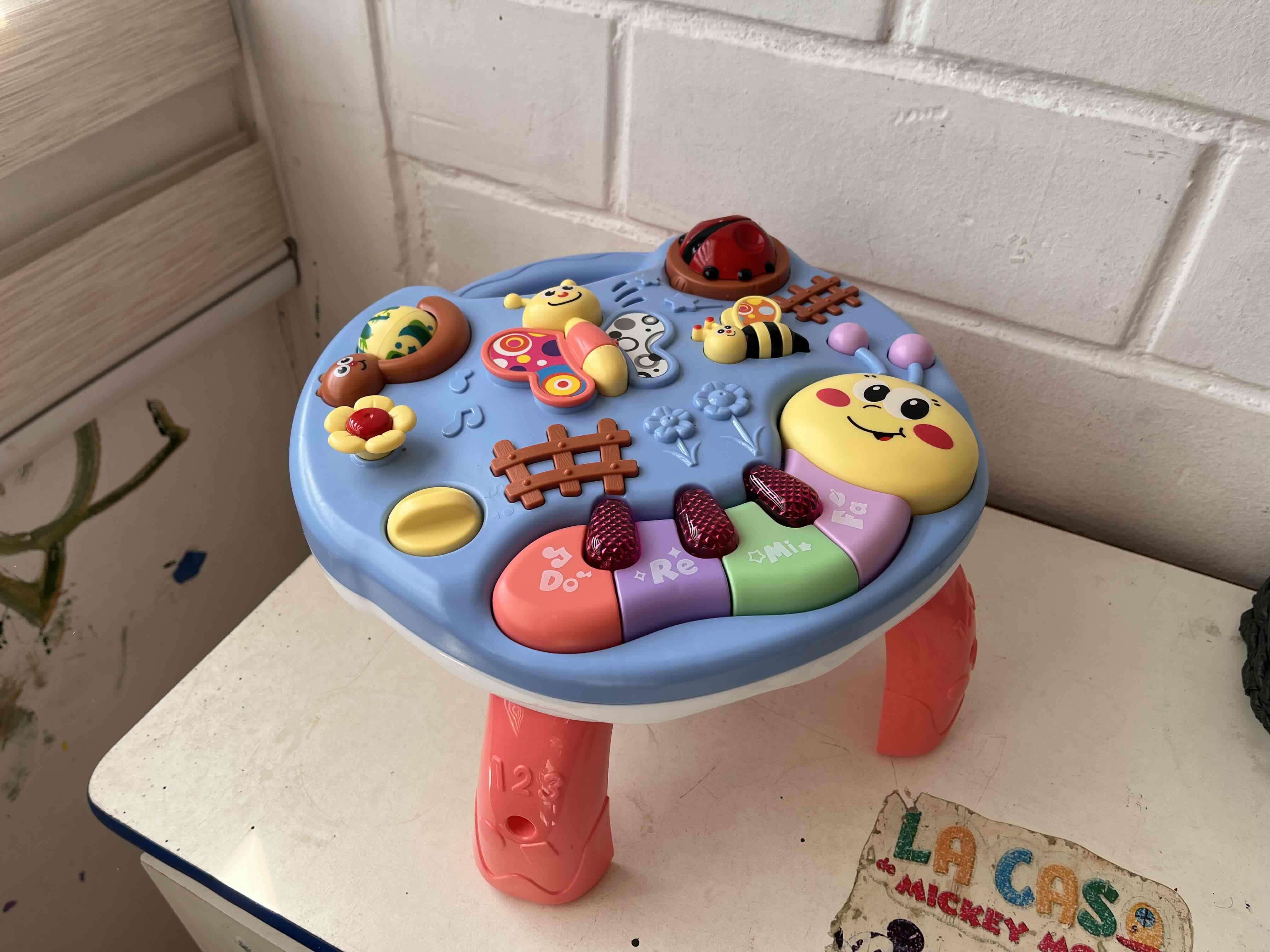 Mesa de actividades para niños, con colores llamativos y juguetes interactivos. Ideal para el desarrollo sensorial y motor.