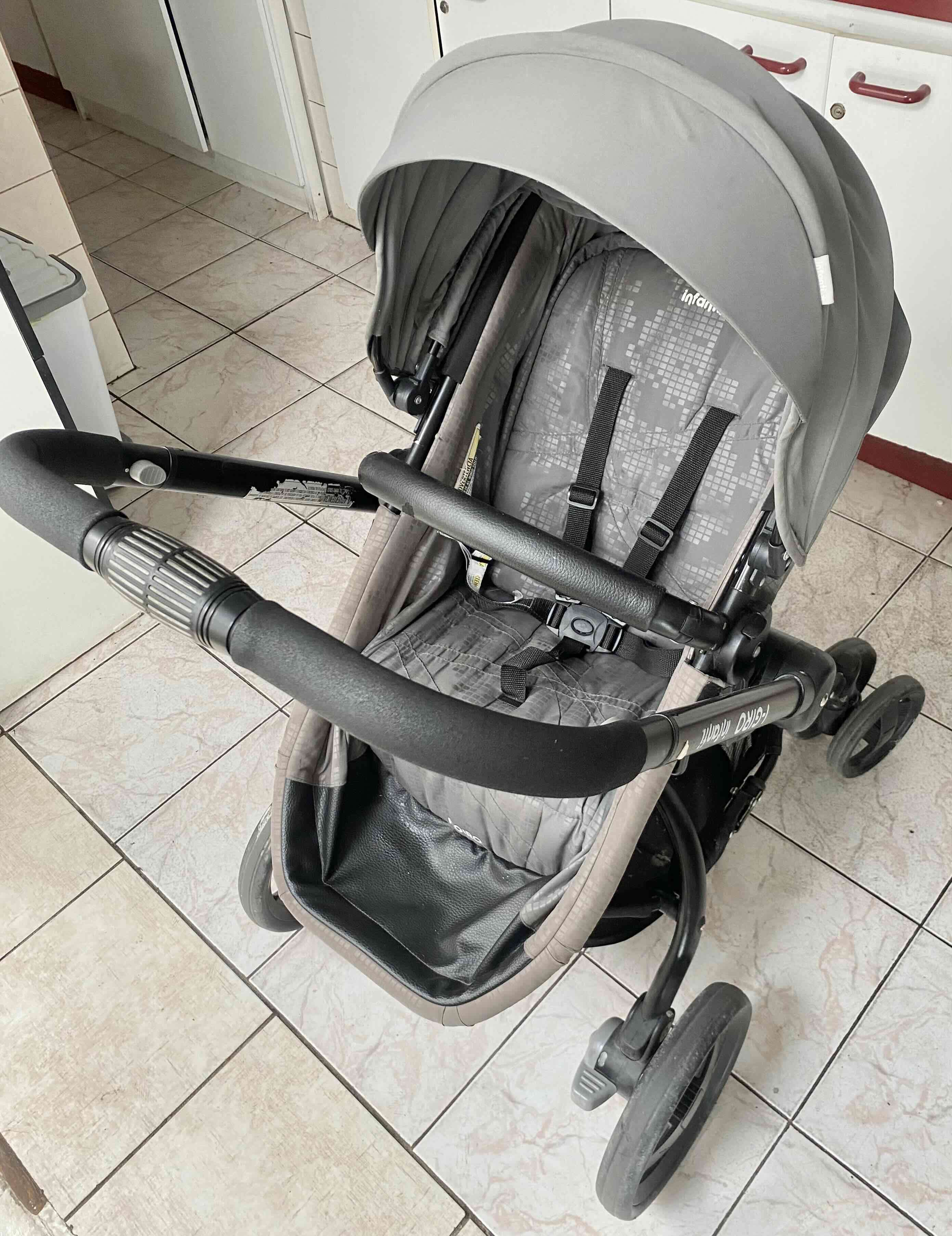 Coche de bebé en buen estado, color gris y diseño moderno. Giro rápido en 360 grados. Configuración a coche cuna y de paseo. Incluye huevito y base para instalar en auto. Grande, resistente, muy bueno.