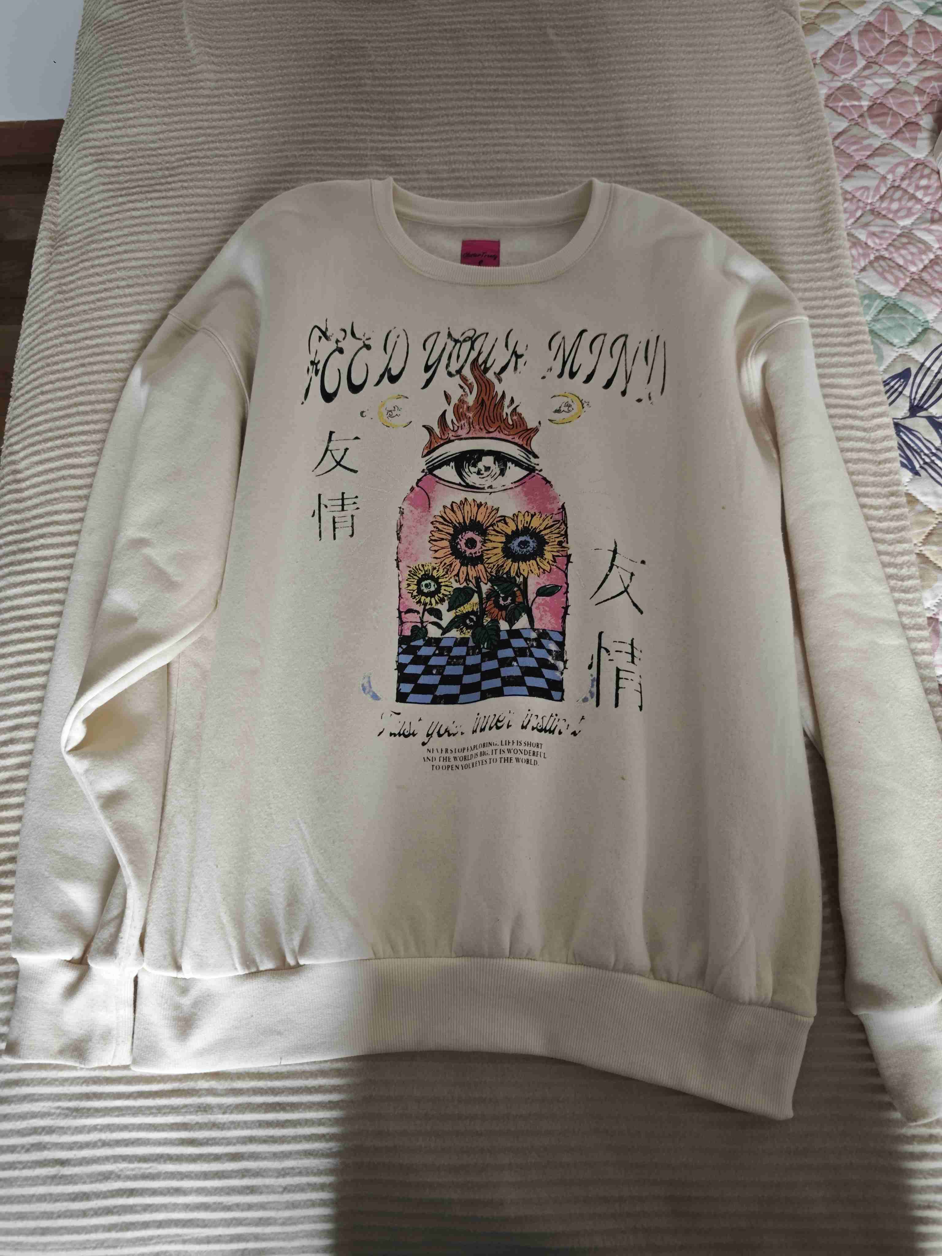 Polerón color crema con diseño gráfico original. Ideal para looks casuales. Nuevo, solo se sacó la etiqueta y 1 postura que fue para probarse Etiqueta talla S da para M