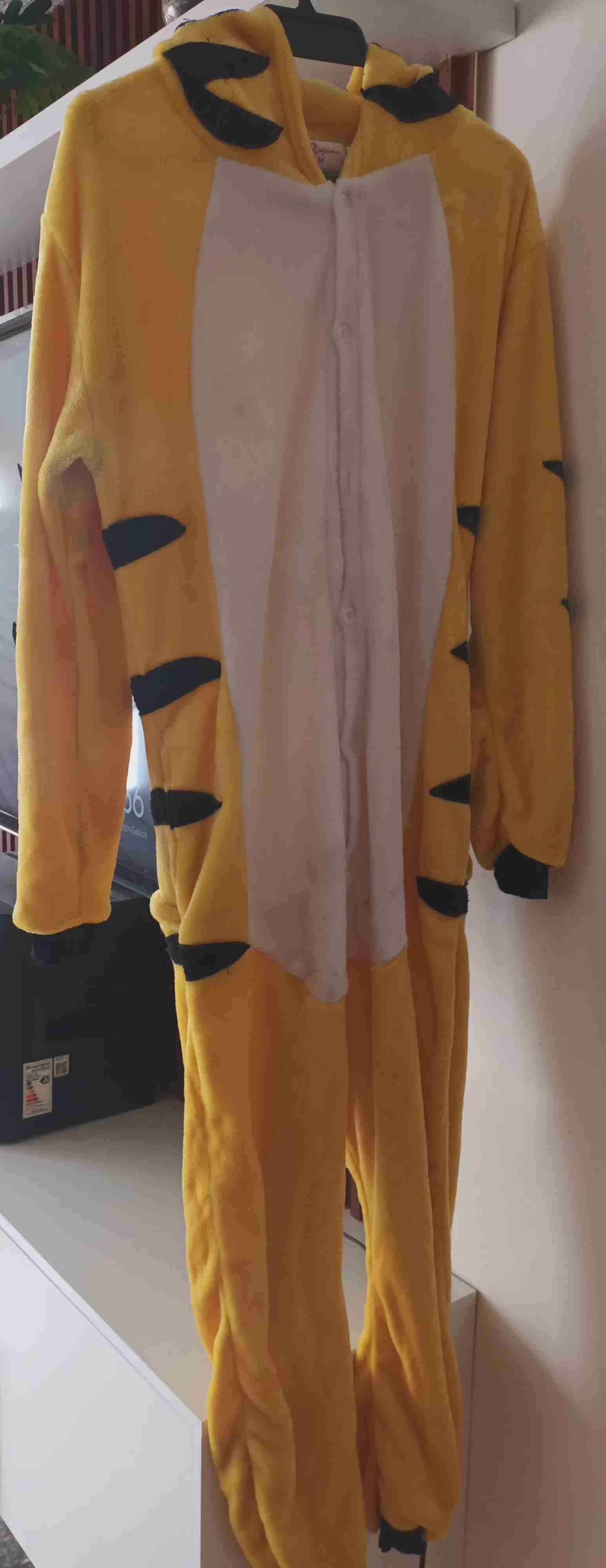 Pijama enterizo con diseño de tigre, en tonos amarillos y blancos. Perfecto para noches frías, en buen estado general.
