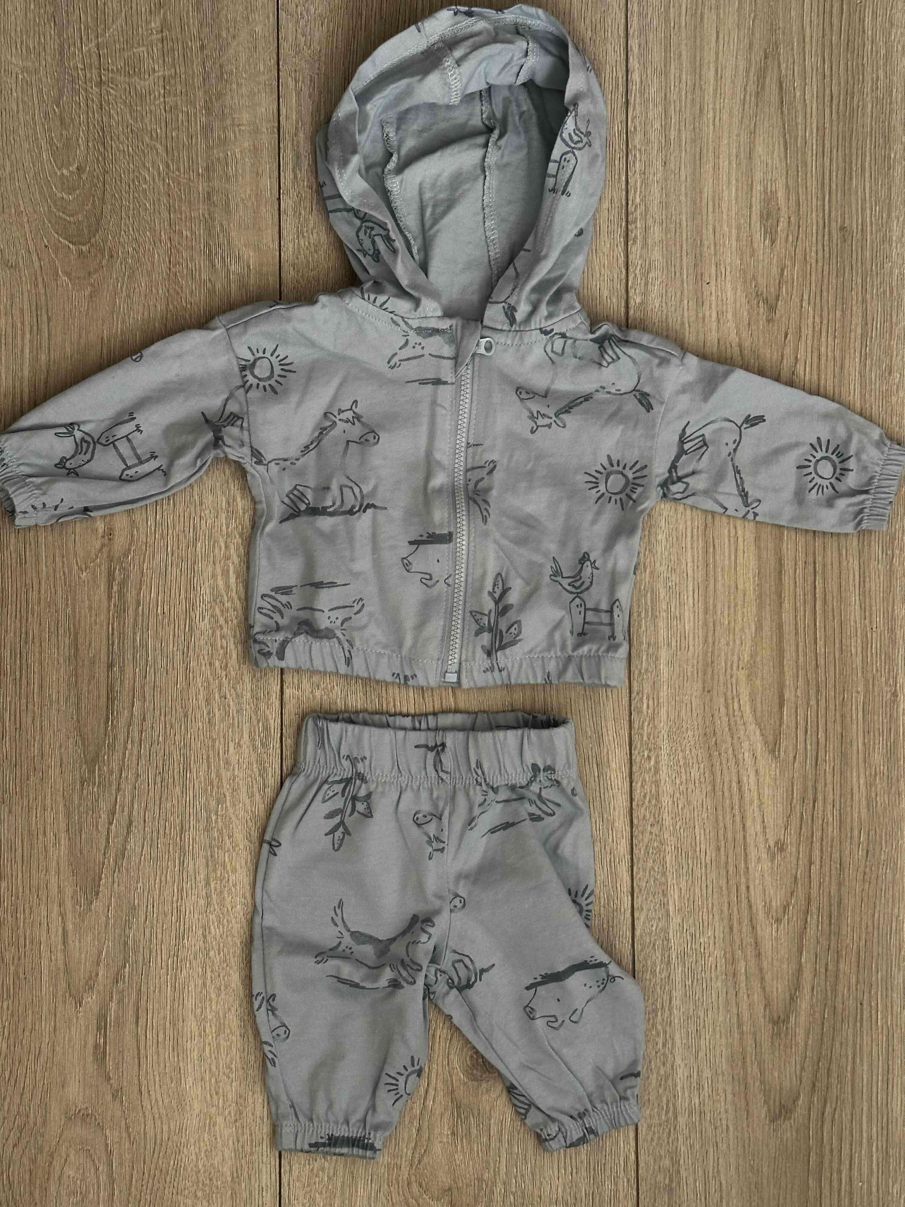 Conjunto para bebé color celeste, incluye polerón con gorro y pantalones. Diseño animal print, ideal para días fríos.