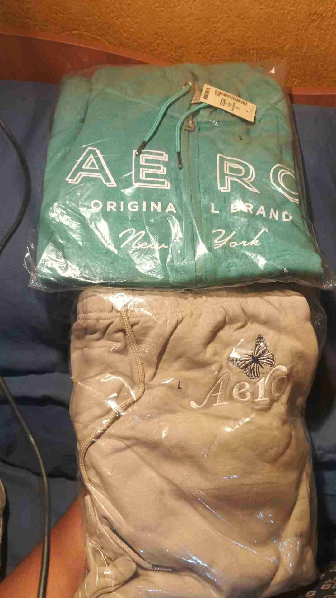 Conjunto deportivo de dos piezas, sudadera verde y pantalón beige, perfecto para un look casual. Nuevo con etiquetas.
