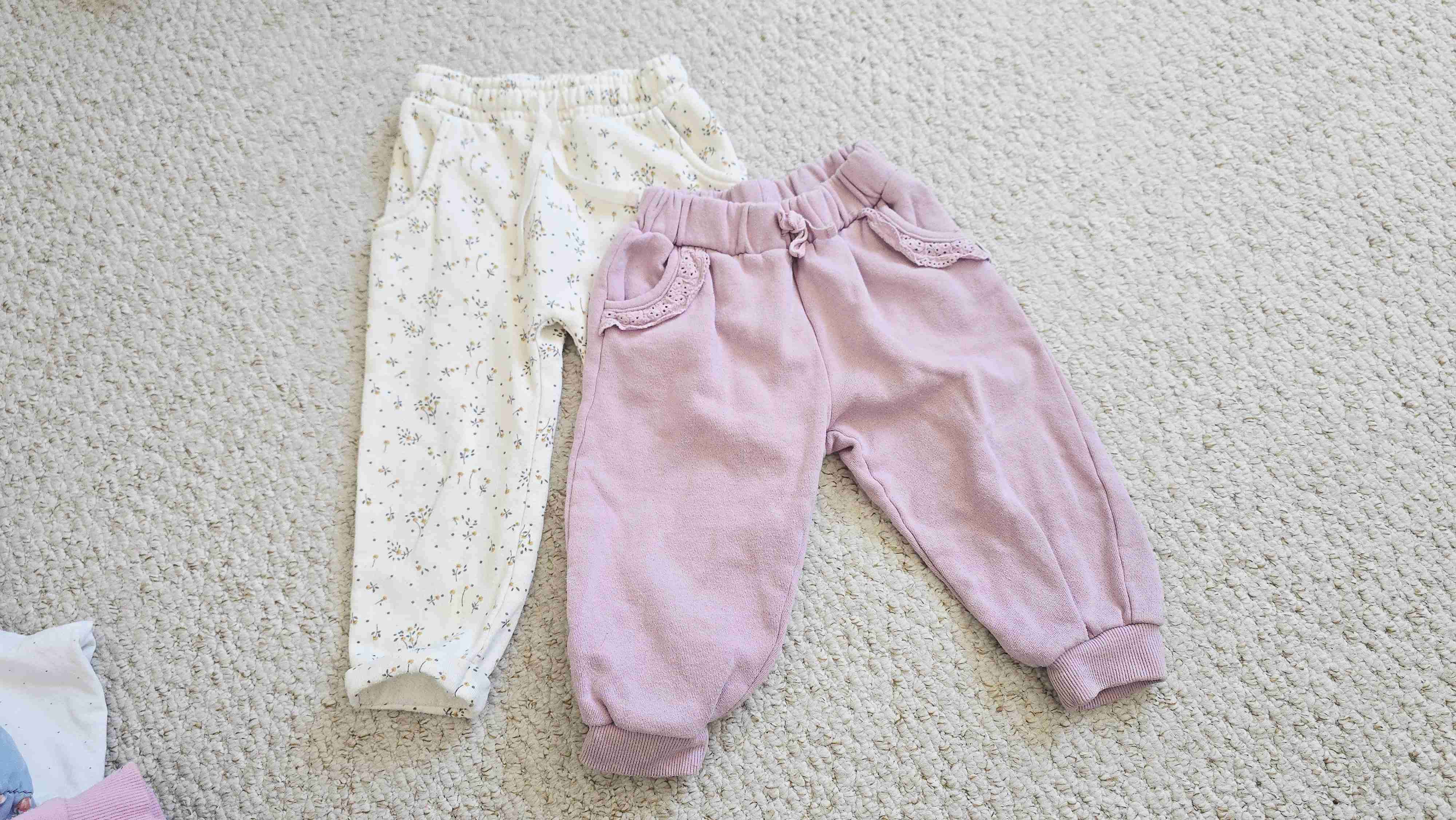 Pantalones para bebé, suaves y cómodos. Uno en tono lila y otro blanco con estampado floral. Perfectos para el día a día. Talla 24 meses