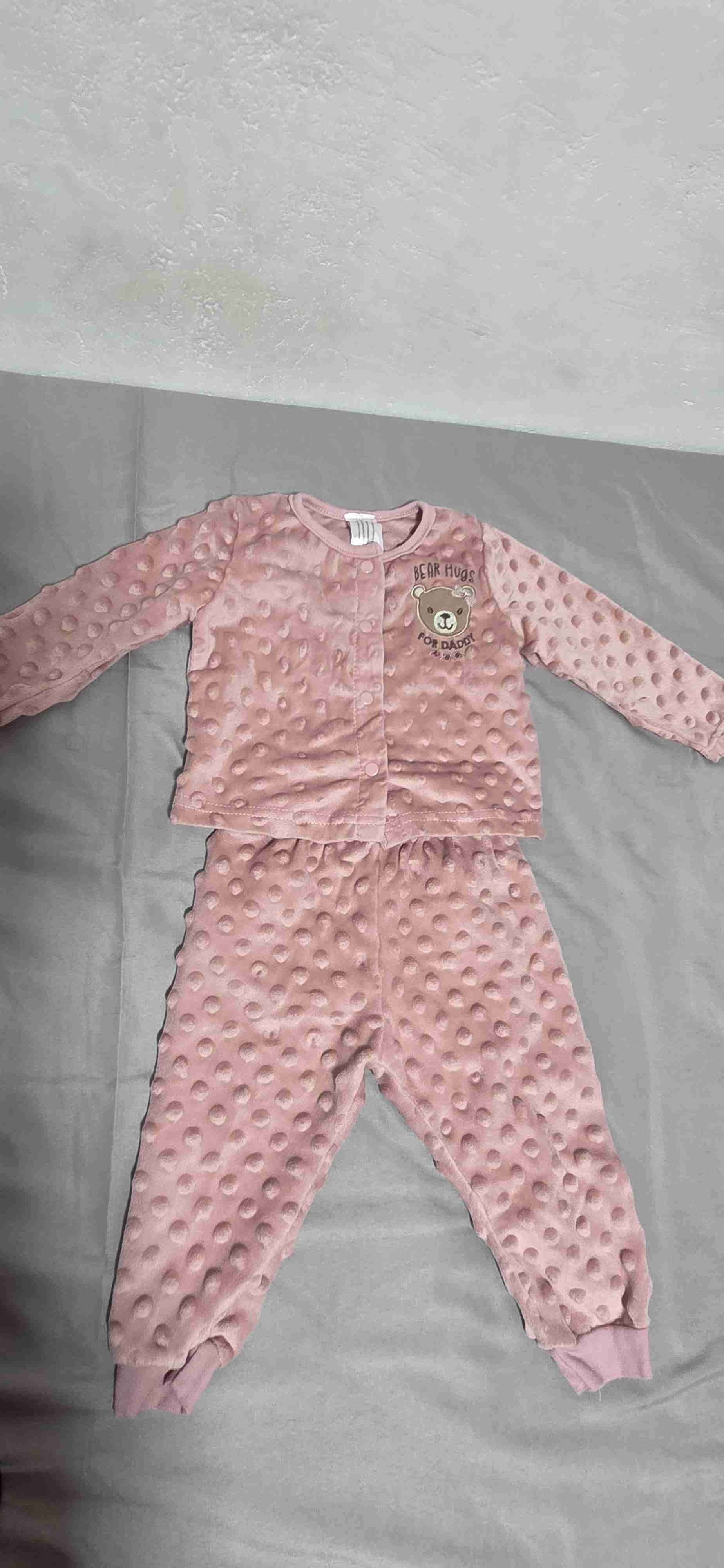Conjunto suave de dos piezas en color rosado con diseño de osito. Ideal para mantener a tu bebé abrigado en casa.