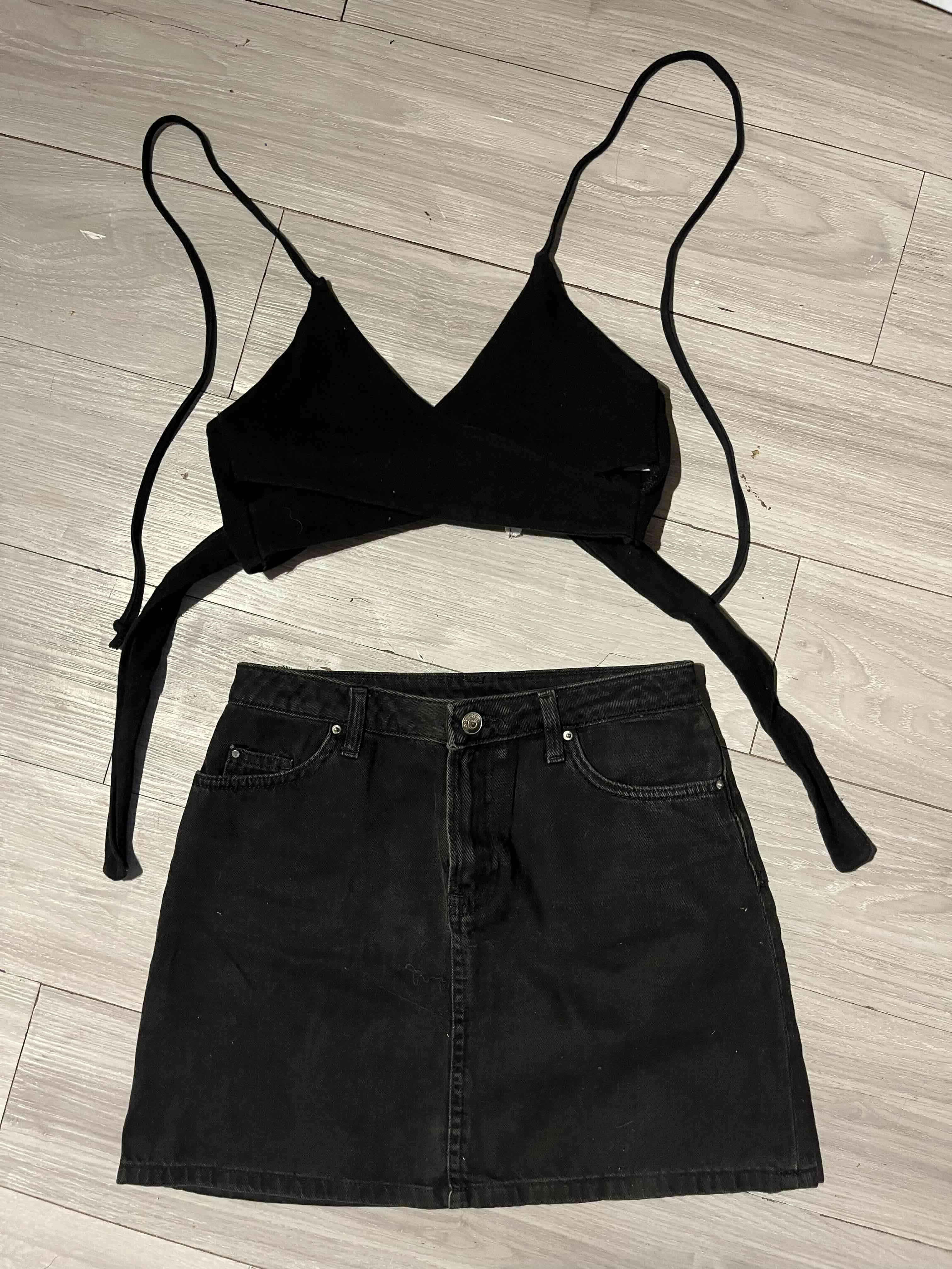 Conjunto de top corto y falda negra ajustada, ideal para salidas casuales. En buen estado con signos leves de uso.