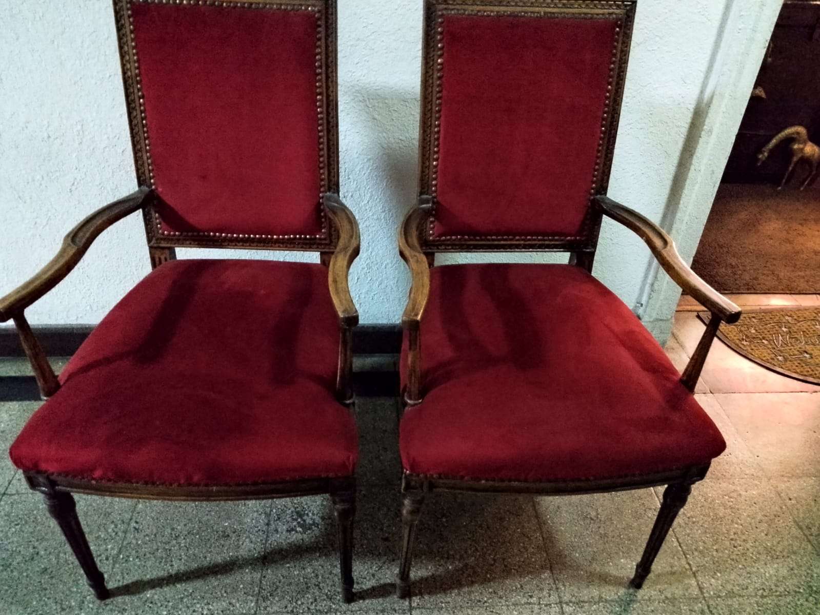 Estas sillas son sillones de estilo Luis XVI, caracterizados por sus líneas rectas, respaldos rectangulares y patas acanaladas que evocan la arquitectura clásica. El par mostrado presenta una tapicería de terciopelo rojo con detalles de tachuelas decorativas y estructuras de madera tallada