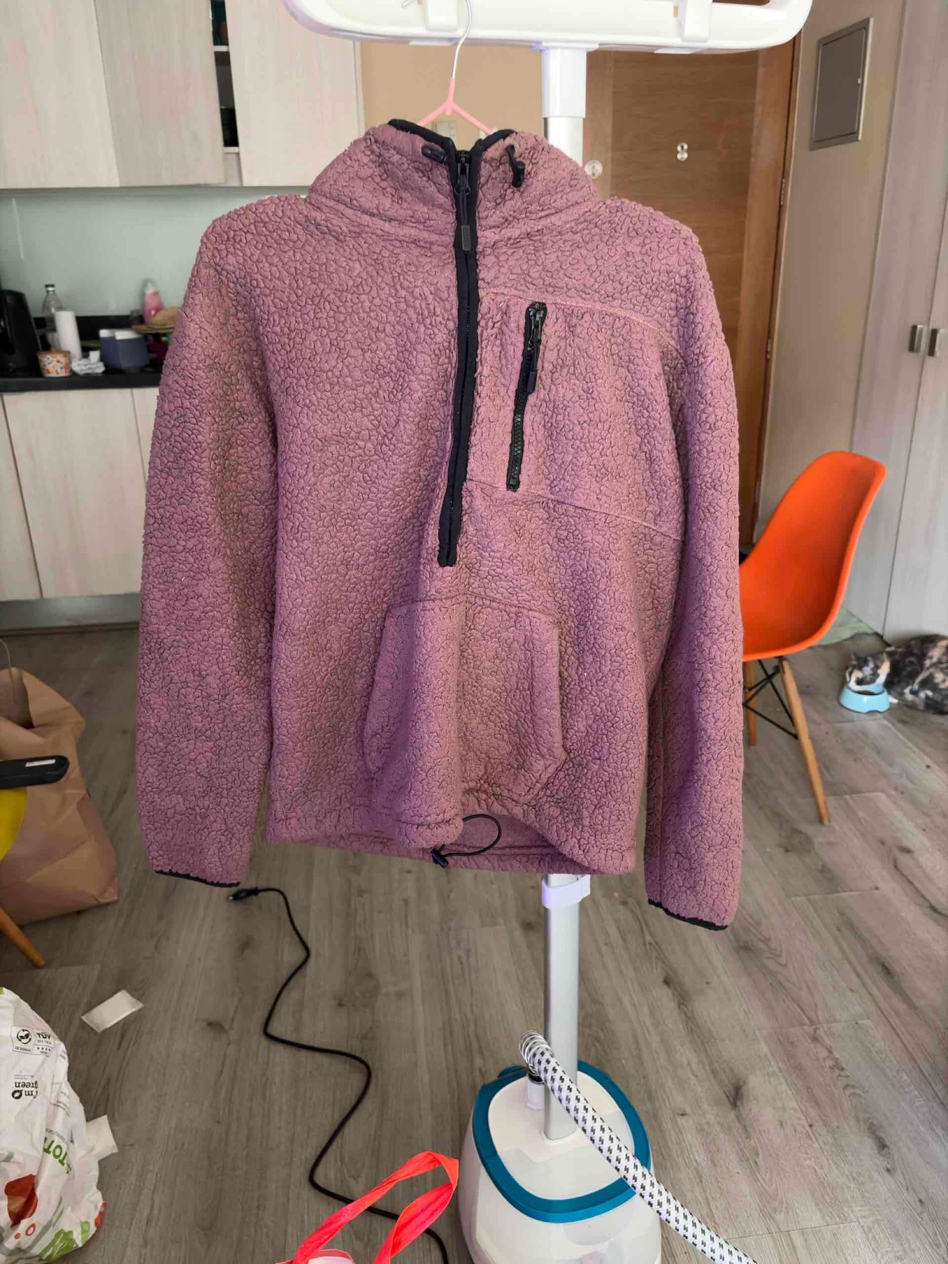 Corderito morado con cierre y bolsillo frontal. Ideal para el frío, en buen estado y cómodo. Talla S-M