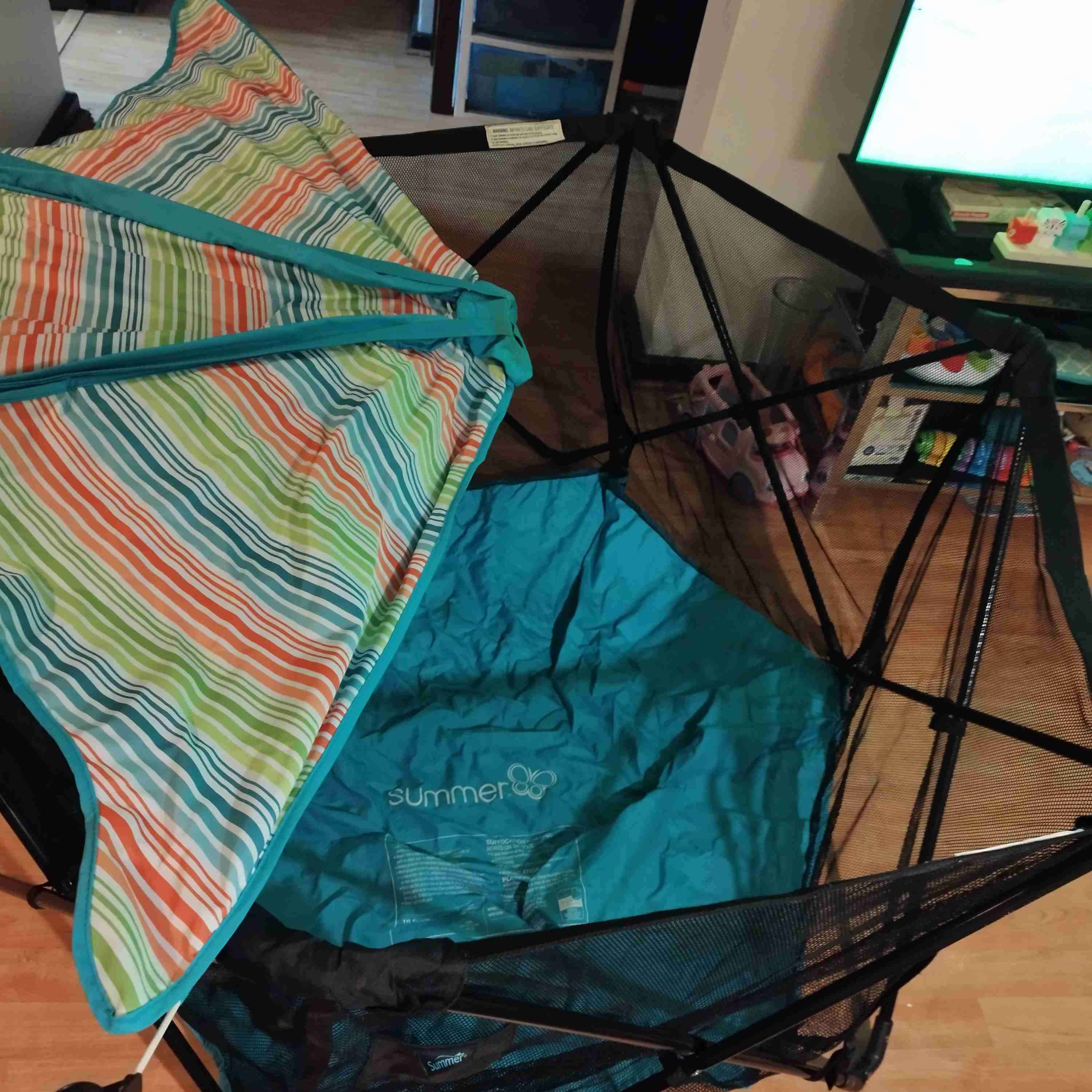 Corral de juegos seguro y práctico para bebés. Incluye techo desmontable de rayas coloridas. Ideal para uso en interiores y exteriores. Traido de USA,tiene toldo para usar en exterior