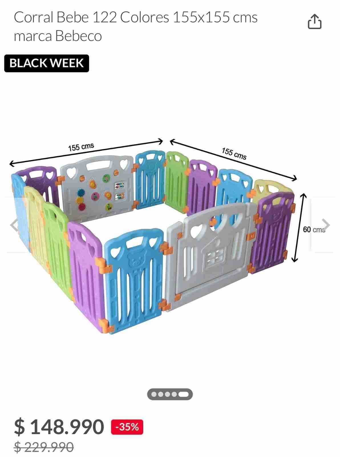 Corral para bebé, ideal para un espacio seguro y divertido. Fácil de armar y transportar. Lavable. Contiene 12 paneles + 1 puerta + 1 tablero de juegos. Se puede armar en 2 tamaños: - 155cms x 155 cms o - 190 cms x 117 cms Se puede coordinar retiro en mi domicilio.