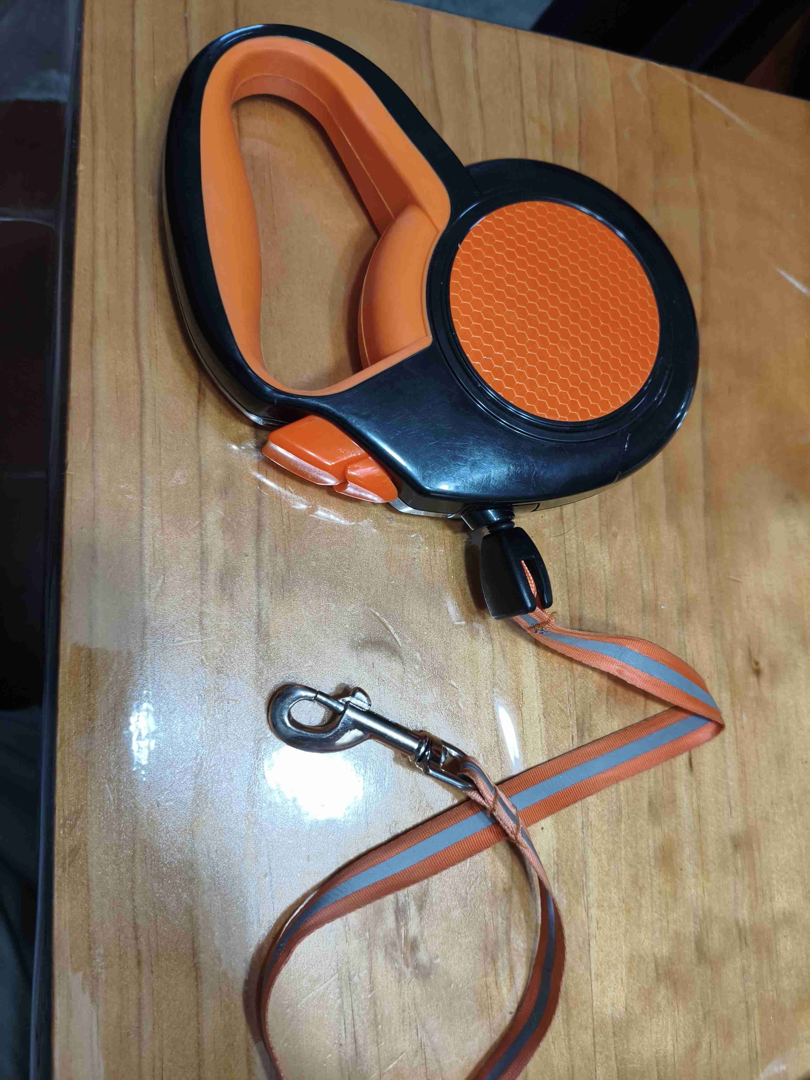 Correa extensible color naranja y negro, ideal para paseos cómodos. Llega a los 8 metros, soporta hasta 30 kilos