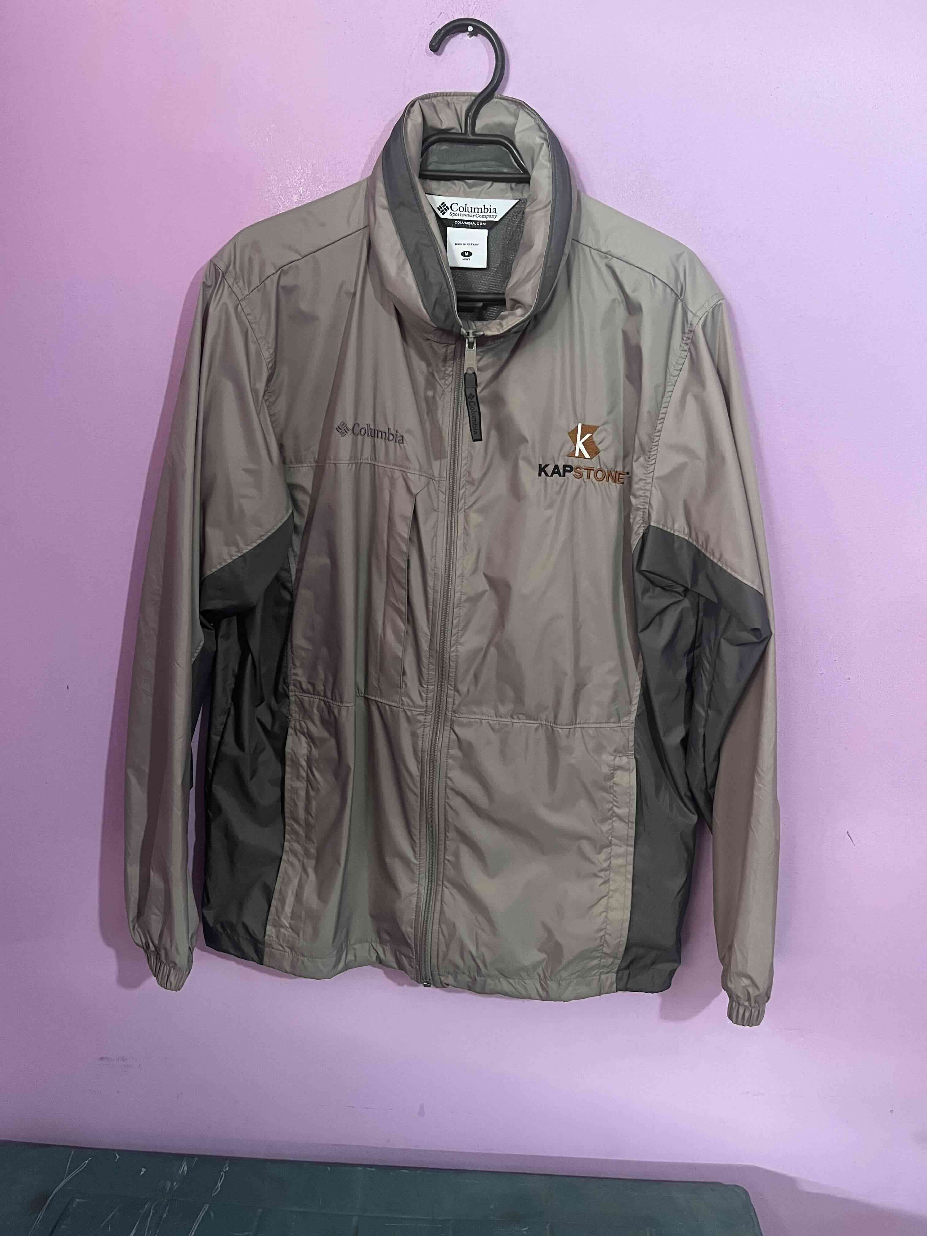 Chaqueta cortaviento gris de la marca Columbia, ideal para días con viento. En buen estado general.
