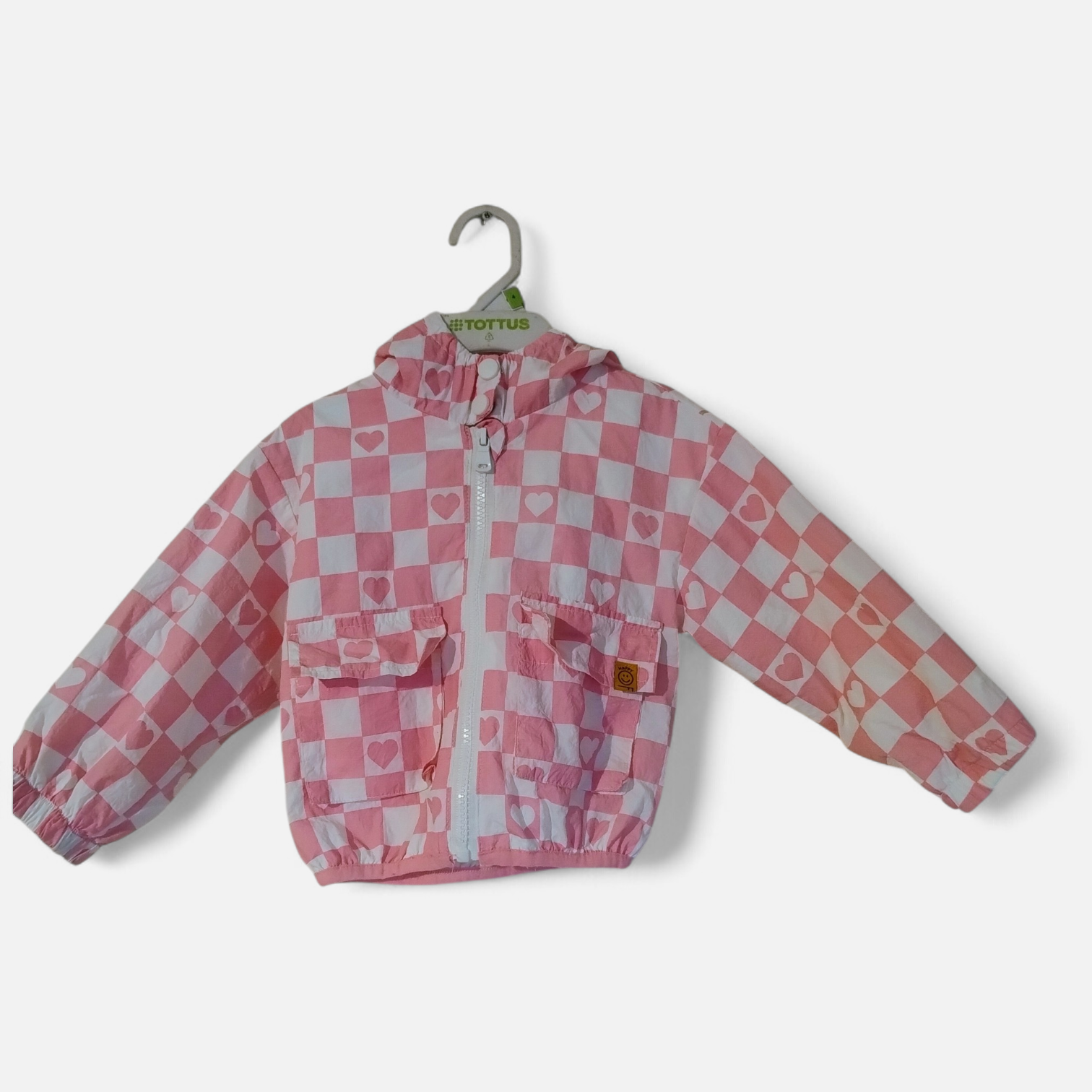Chaqueta cortaviento marca Ficcus para niña en tonos rosados con estampado de corazones. Ideal para estos días de otoño, en buen estado, un par de usos solamente