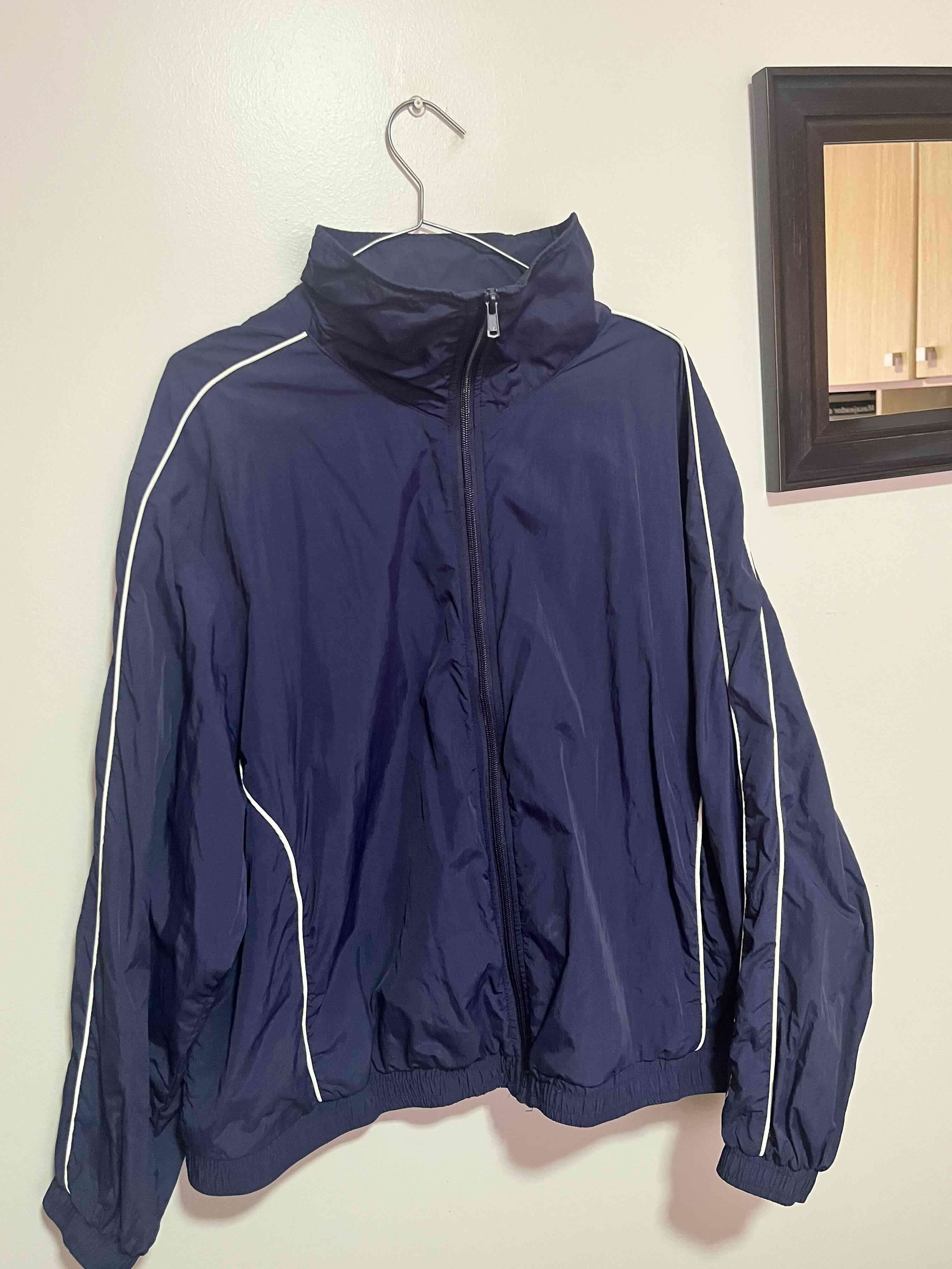 Cortavientos azul con detalles blancos. Ideal para actividades al aire libre. Está en buen estado.
