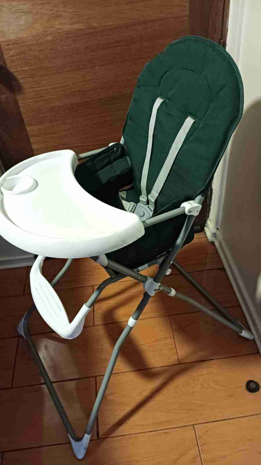 Silla de comer plegable para bebé en buen estado. Color verde oscuro y bandeja blanca. Ideal para la hora de la comida.