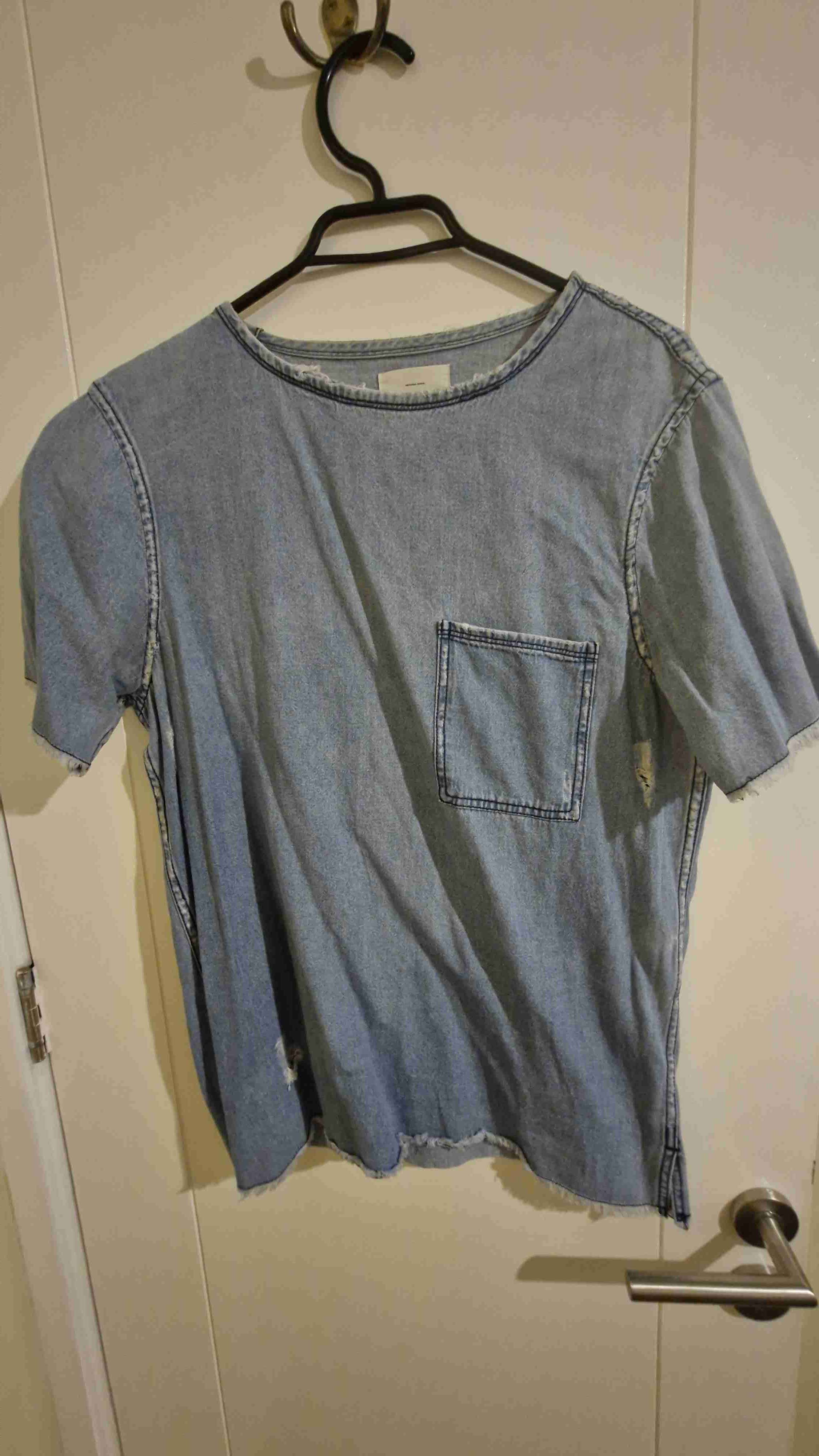 Polera casual de mezclilla con bolsillo frontal. En buen estado, ideal para un look relajado.