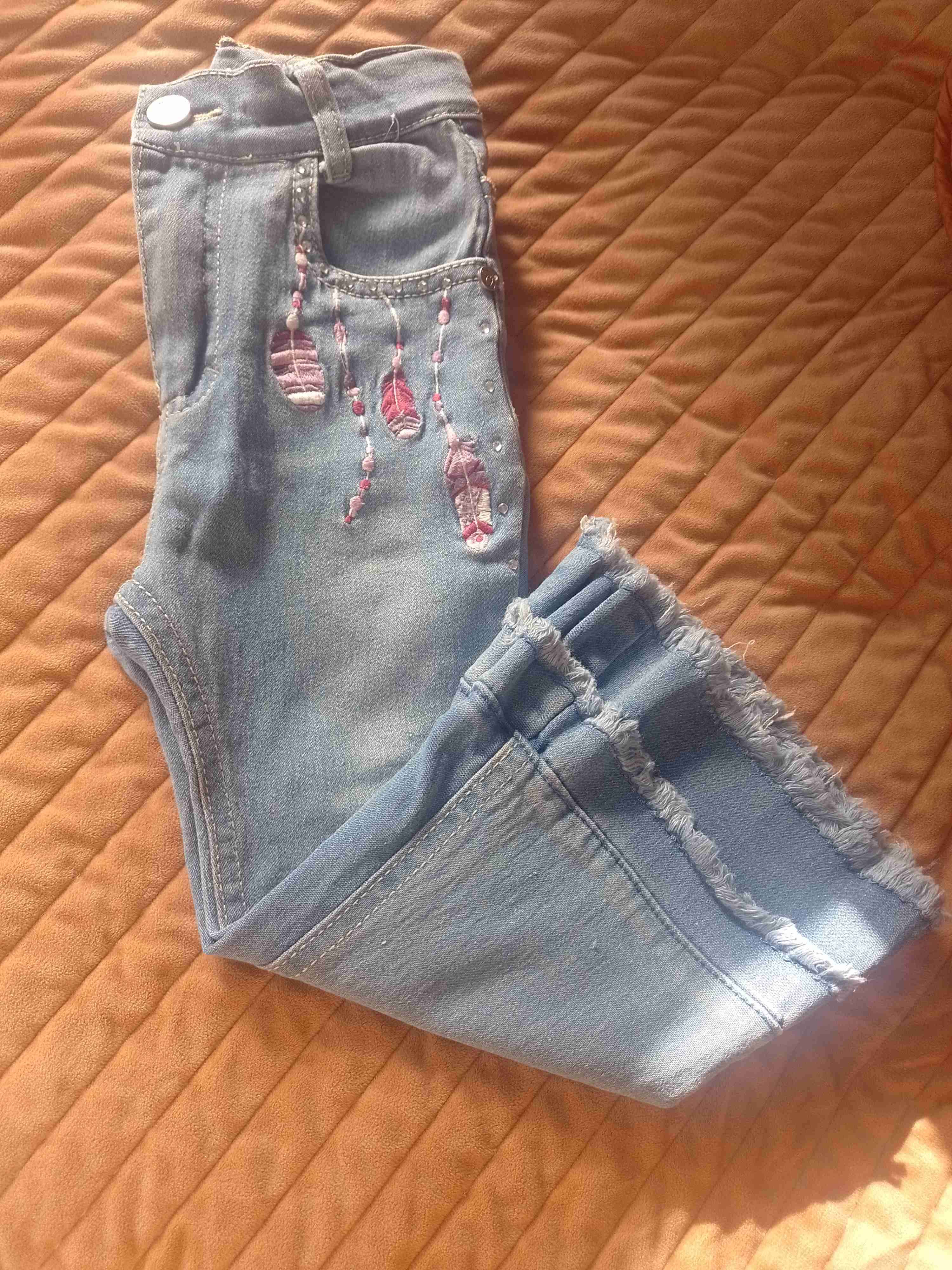 Jeans azules para niña con bordado de plumas rosadas y detalles desgastados en el ruedo. Perfectos para un look casual y cómodo.