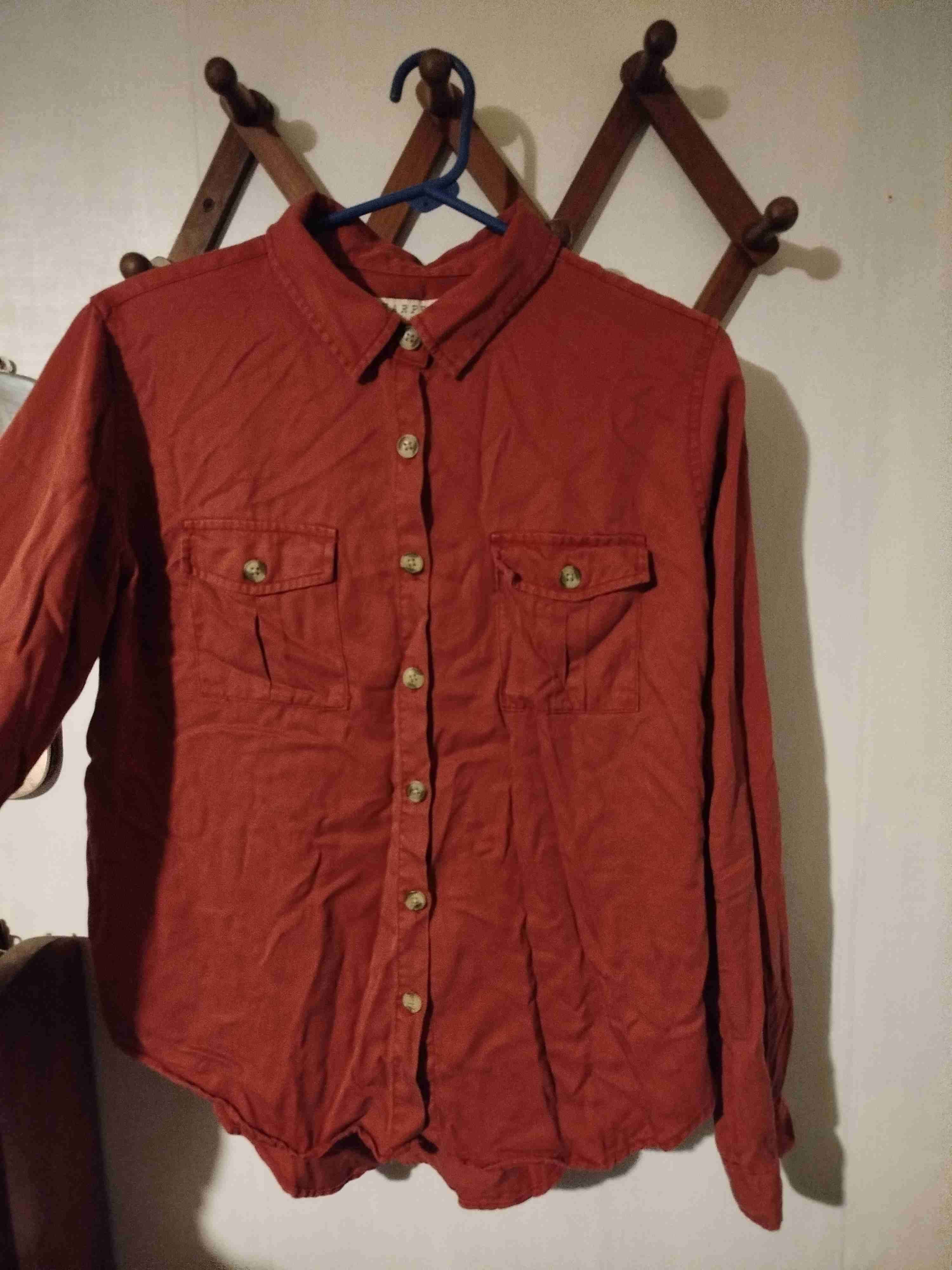 Camisa de franela roja con bolsillos frontales, ideal para días fríos. En buen estado con signos leves de uso.