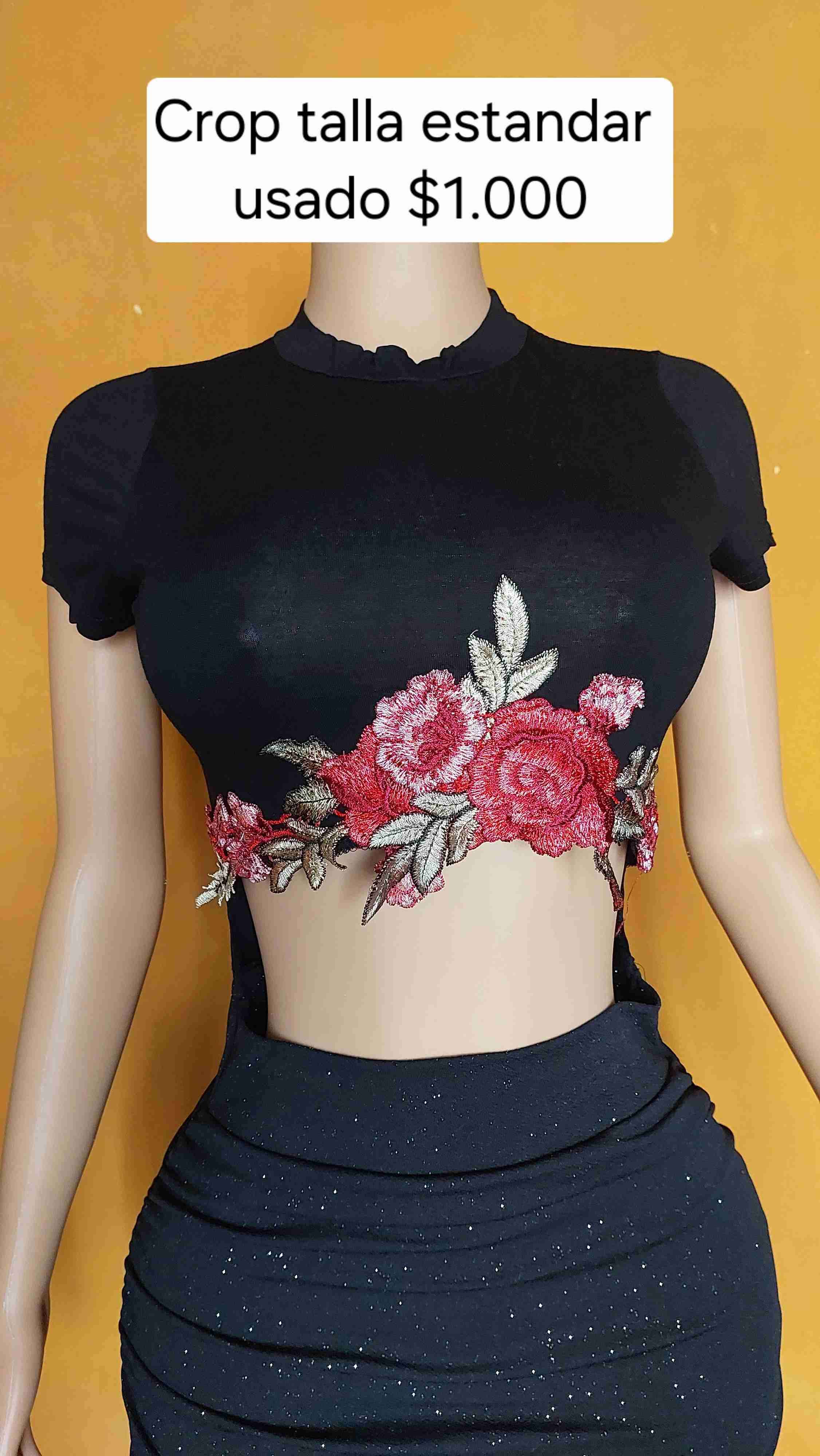 Crop top negro con bordado de flores rojas, ideal para ocasiones casuales. En buen estado general. Talla estandar sm