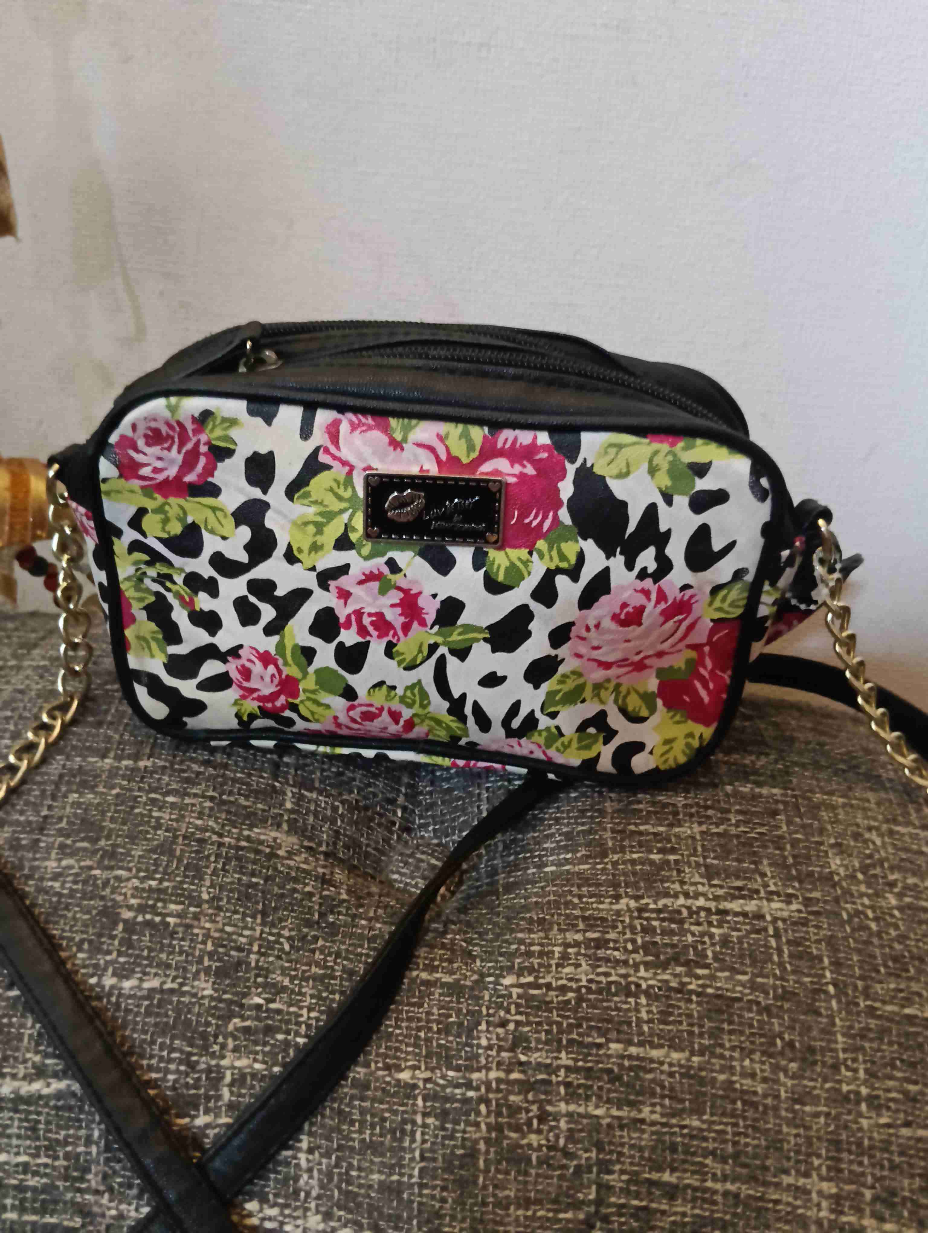 Cartera de mano con diseño floral y cadena dorada. Ideal para salidas casuales. En buen estado. Betsy Johnson