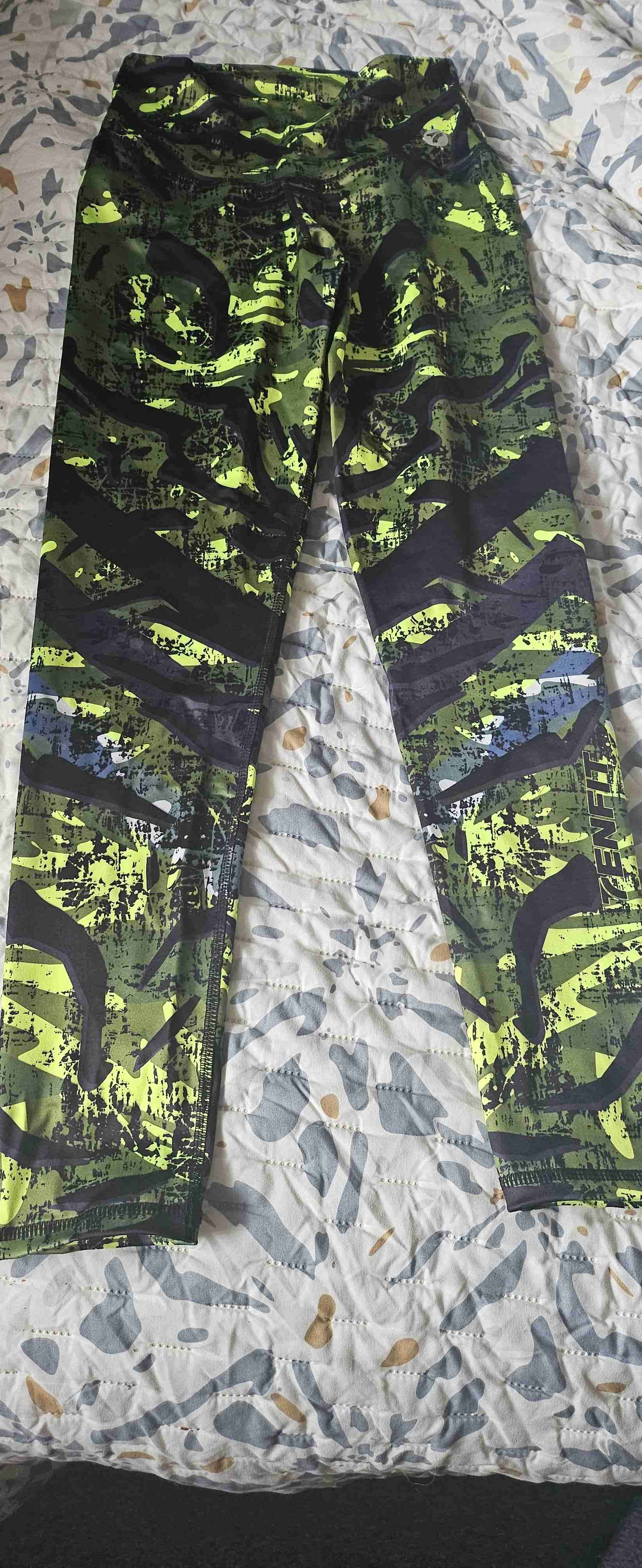 Leggings deportivos con diseño camuflado en tonos verdes. En buen estado, ideales para entrenar o uso casual. Talla M,