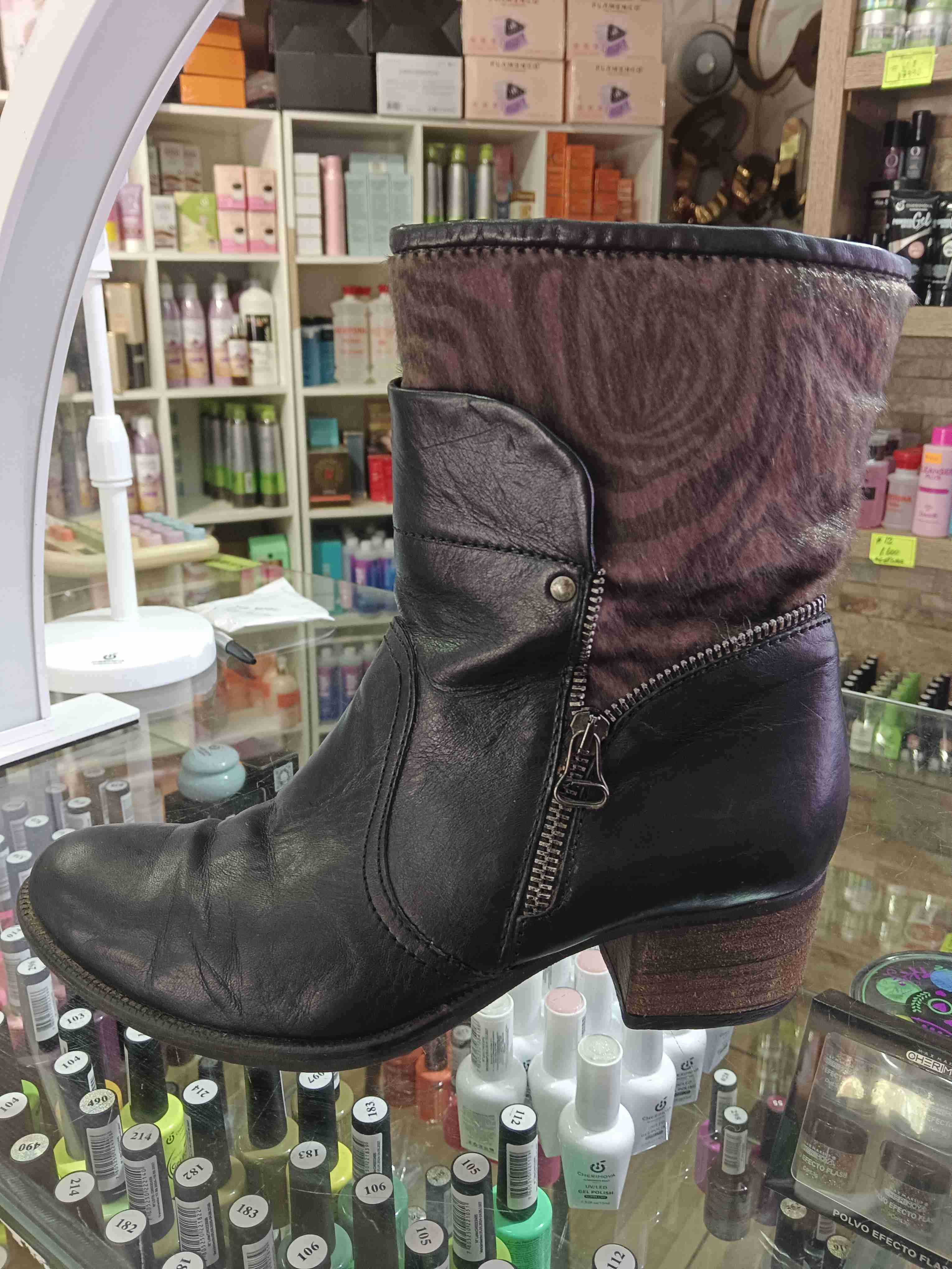 Botín de cuero negro con detalle de animal print. En buen estado, ideal para uso diario o salidas casuales.