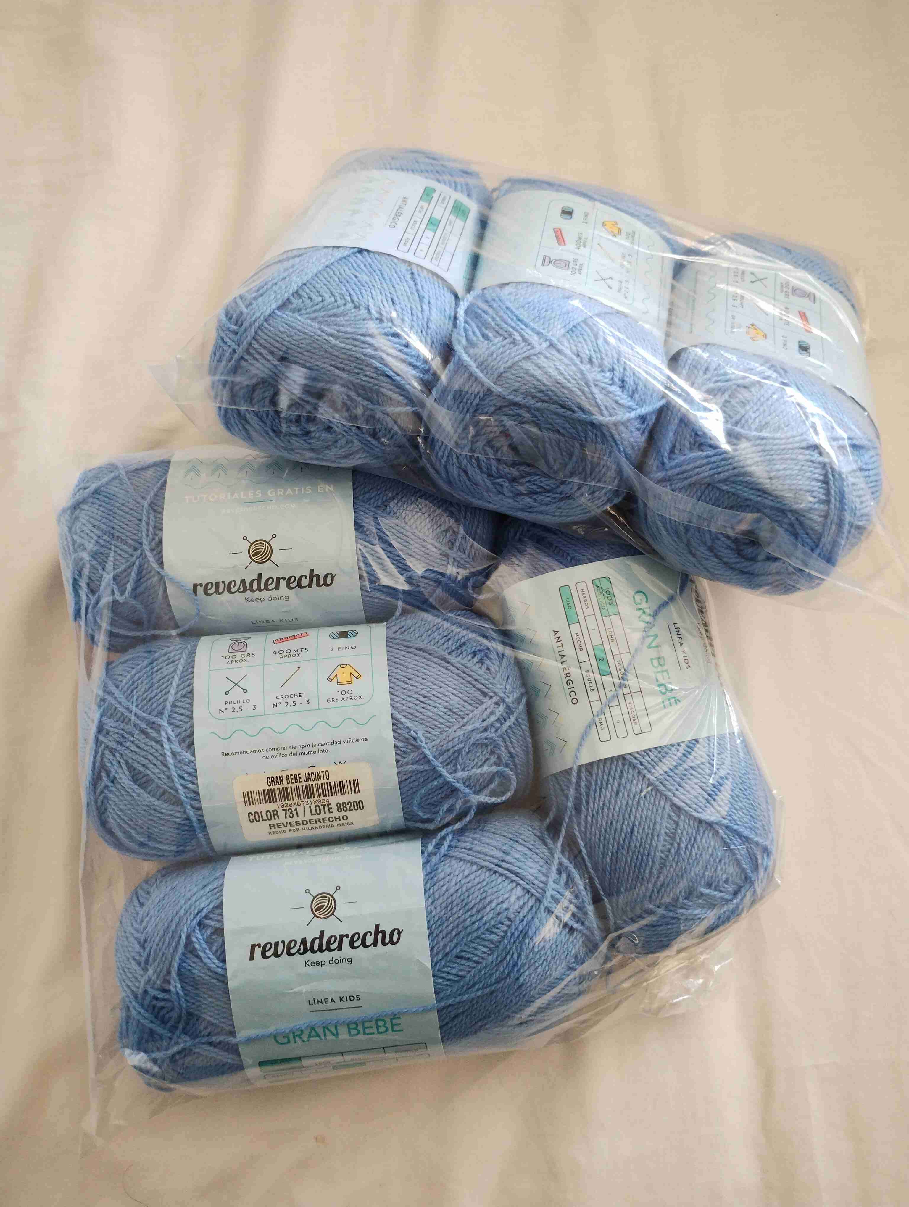 Pack de ovillos de lana azul celeste, ideal para tejer ropa de bebé. Producto nuevo y en excelente estado.