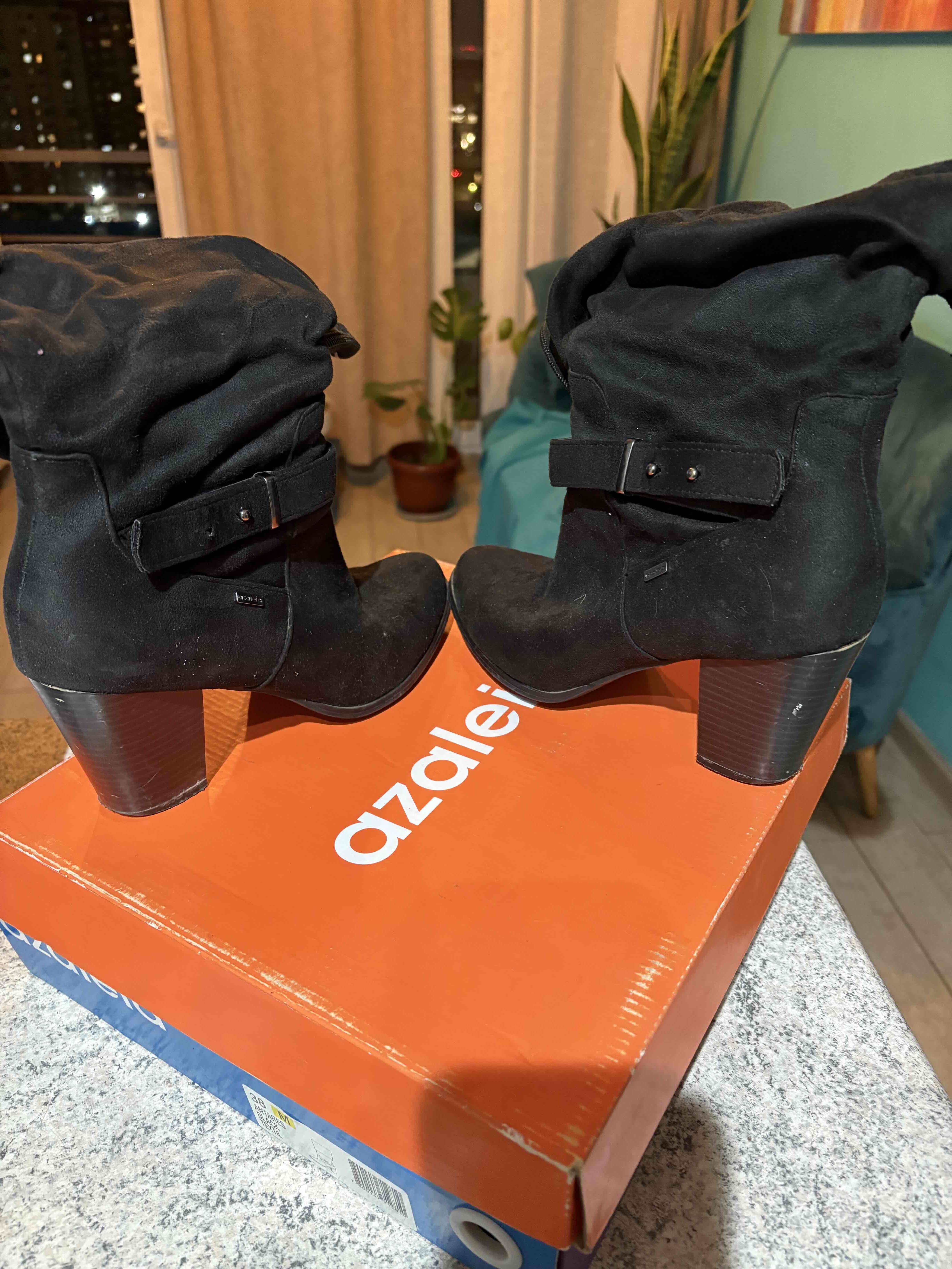 Elegantes botines negros de la marca Azaleia con taco alto. En buen estado, detalle en broche y se deben cambiar tapillas