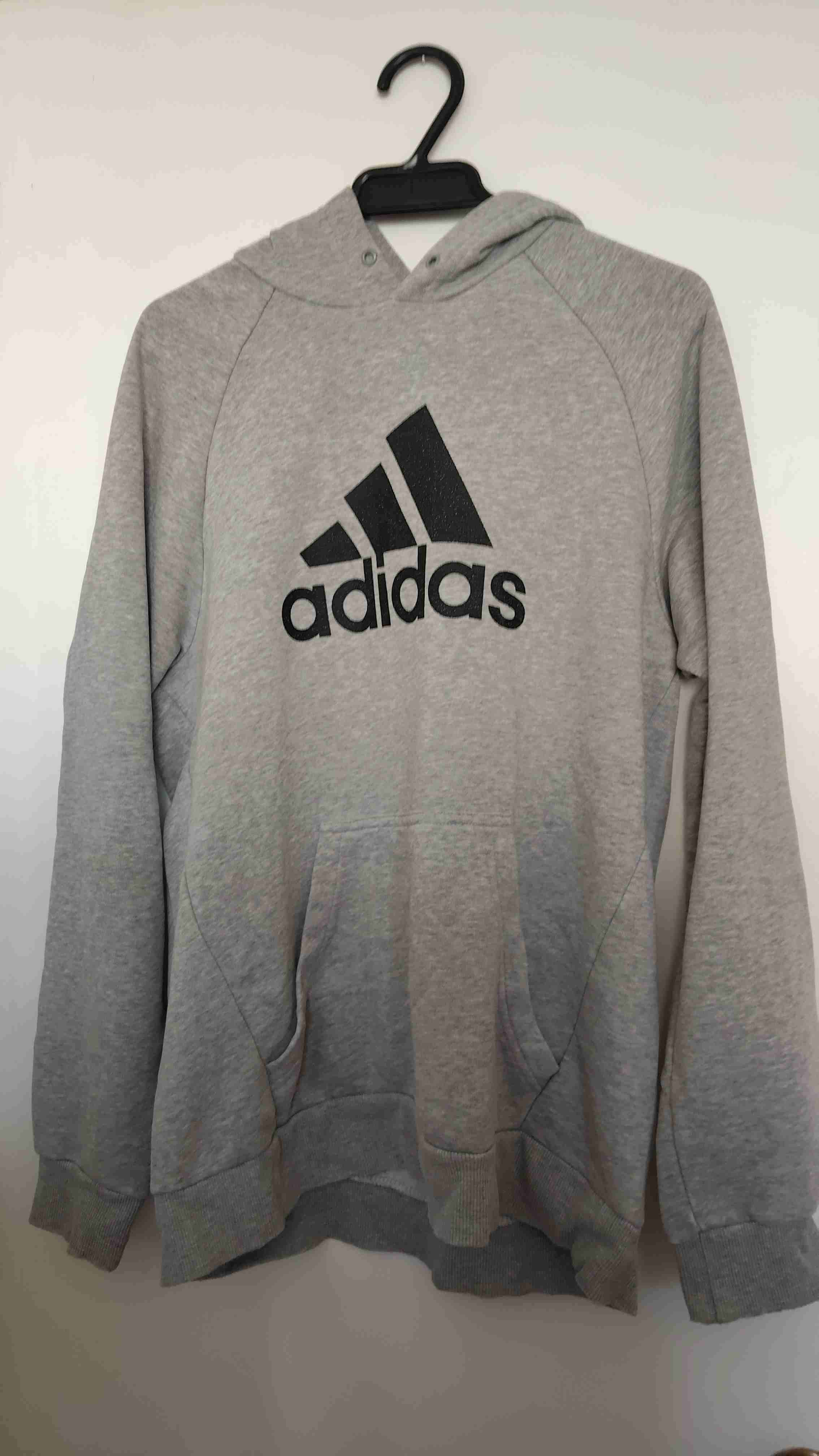 Polerón gris estilo casual con gorro y logo Adidas al frente. Perfecto para deporte, en buen estado con leves signos de uso en mangas.