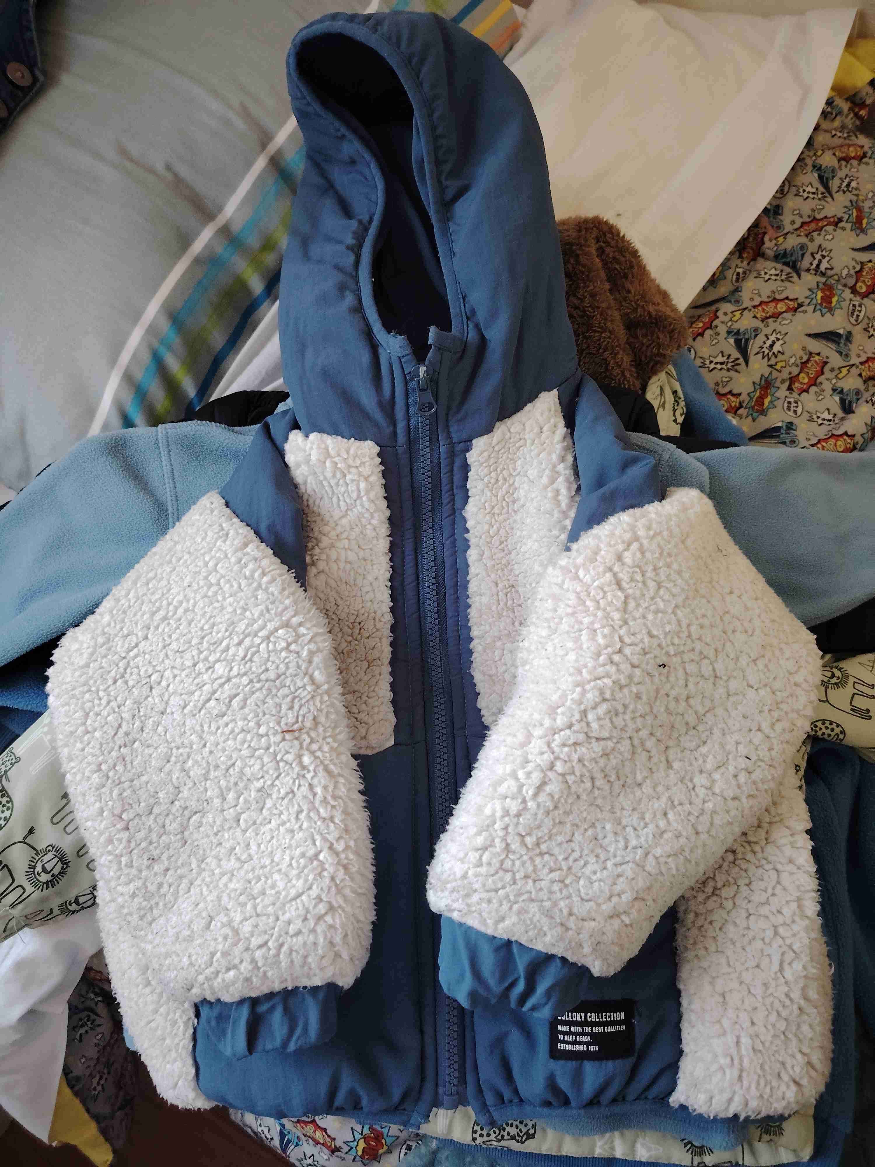 Chaqueta para niño con capucha, color azul y detalles de peluche. Ideal para invierno, en buen estado.