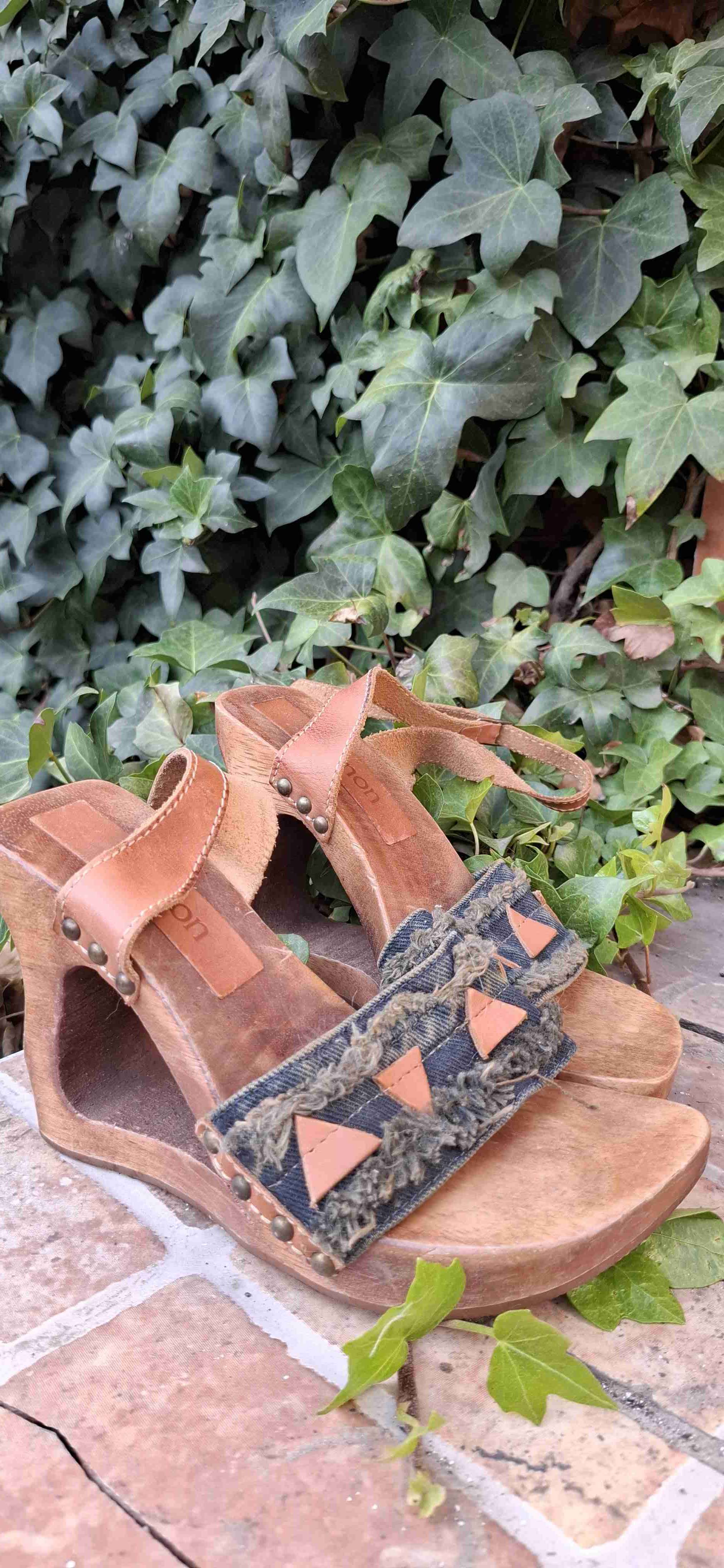Sandalias de plataforma marrón con detalles en denim y adornos. En buen estado, ideal para verano.
