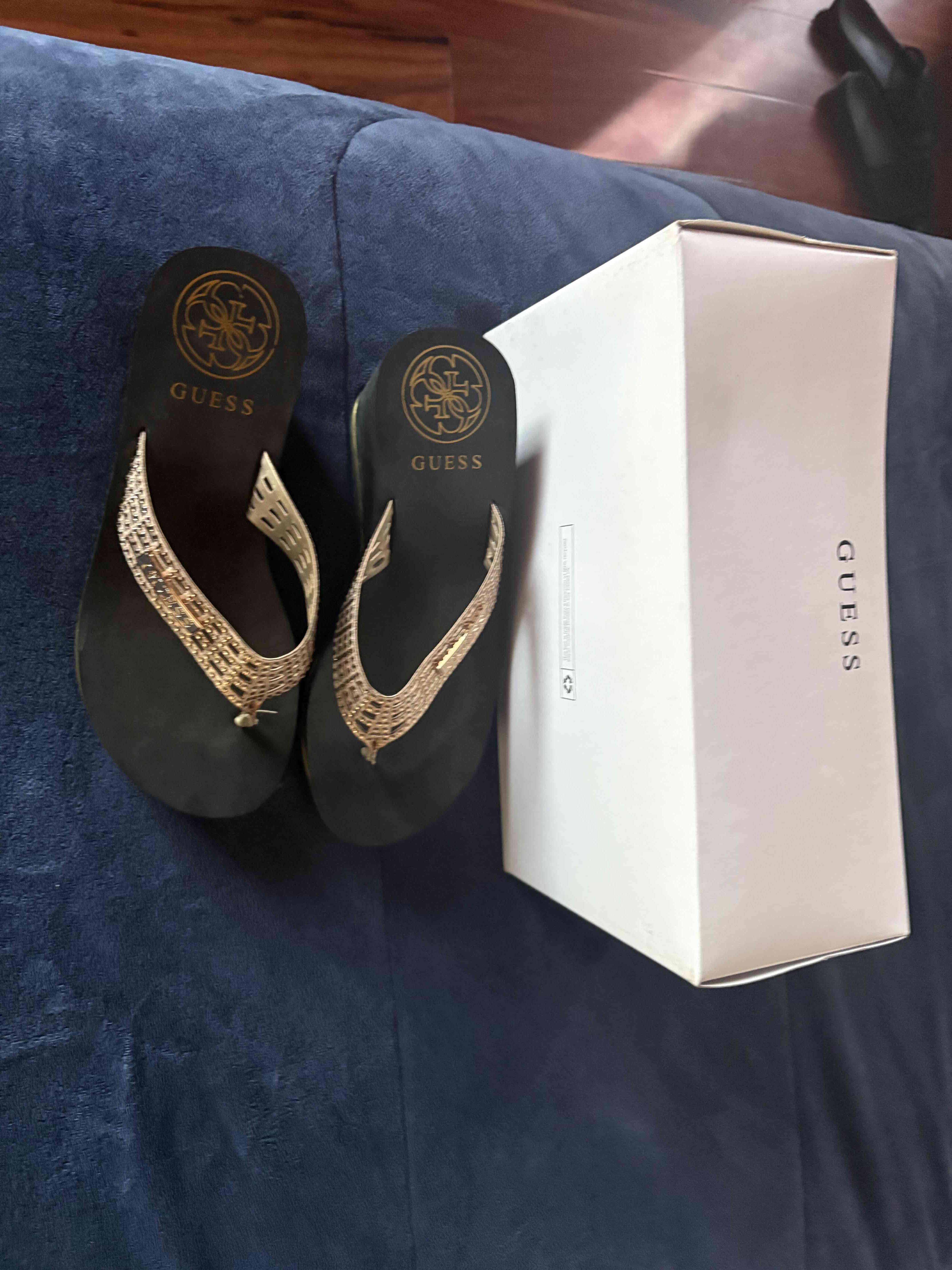 Sandalias estilo flip flop de Guess, color dorado. En buen estado, ideales para ocasiones casuales.